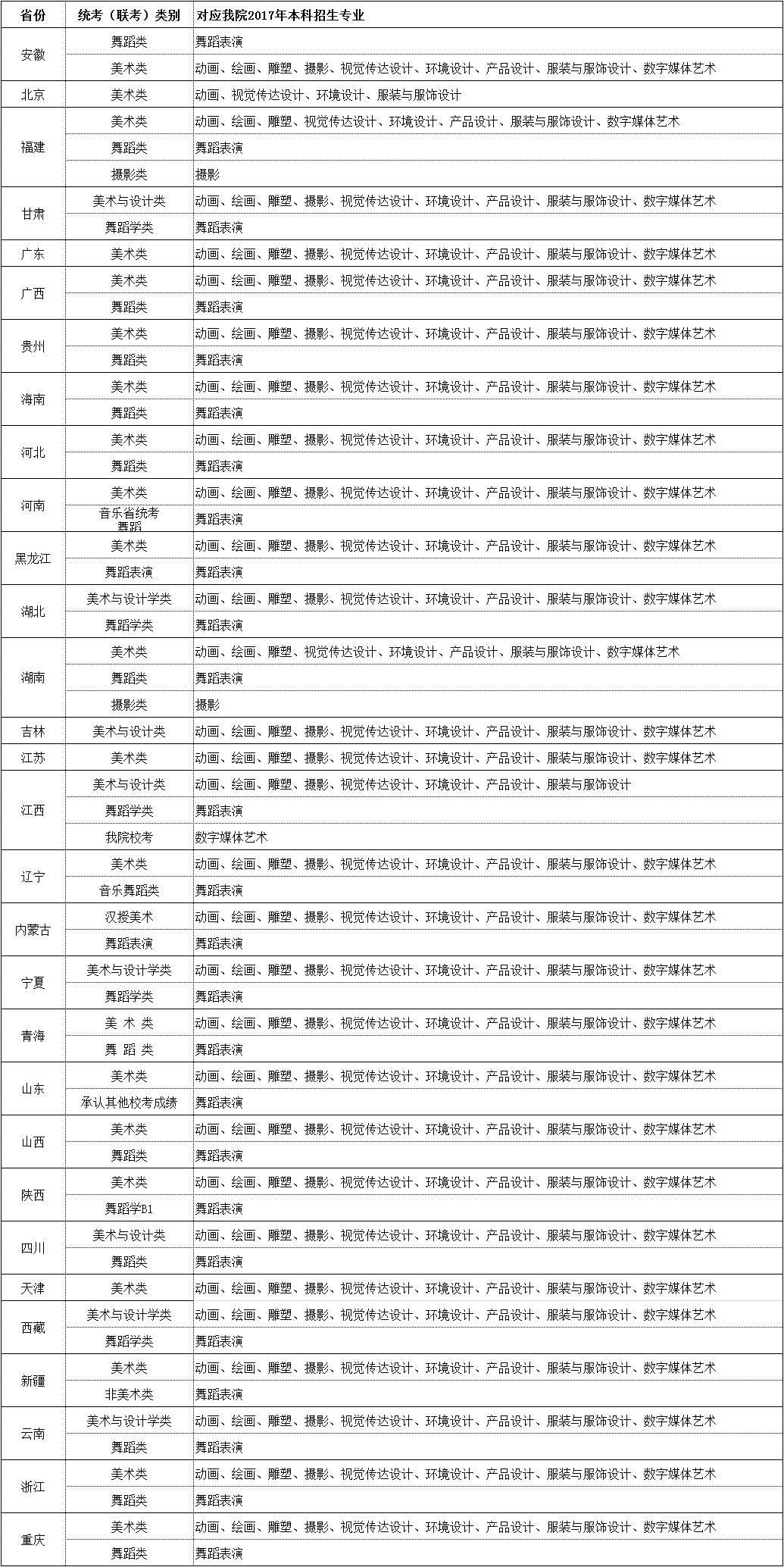 2017年 分省艺术类统考(联考)涵盖我院的专业