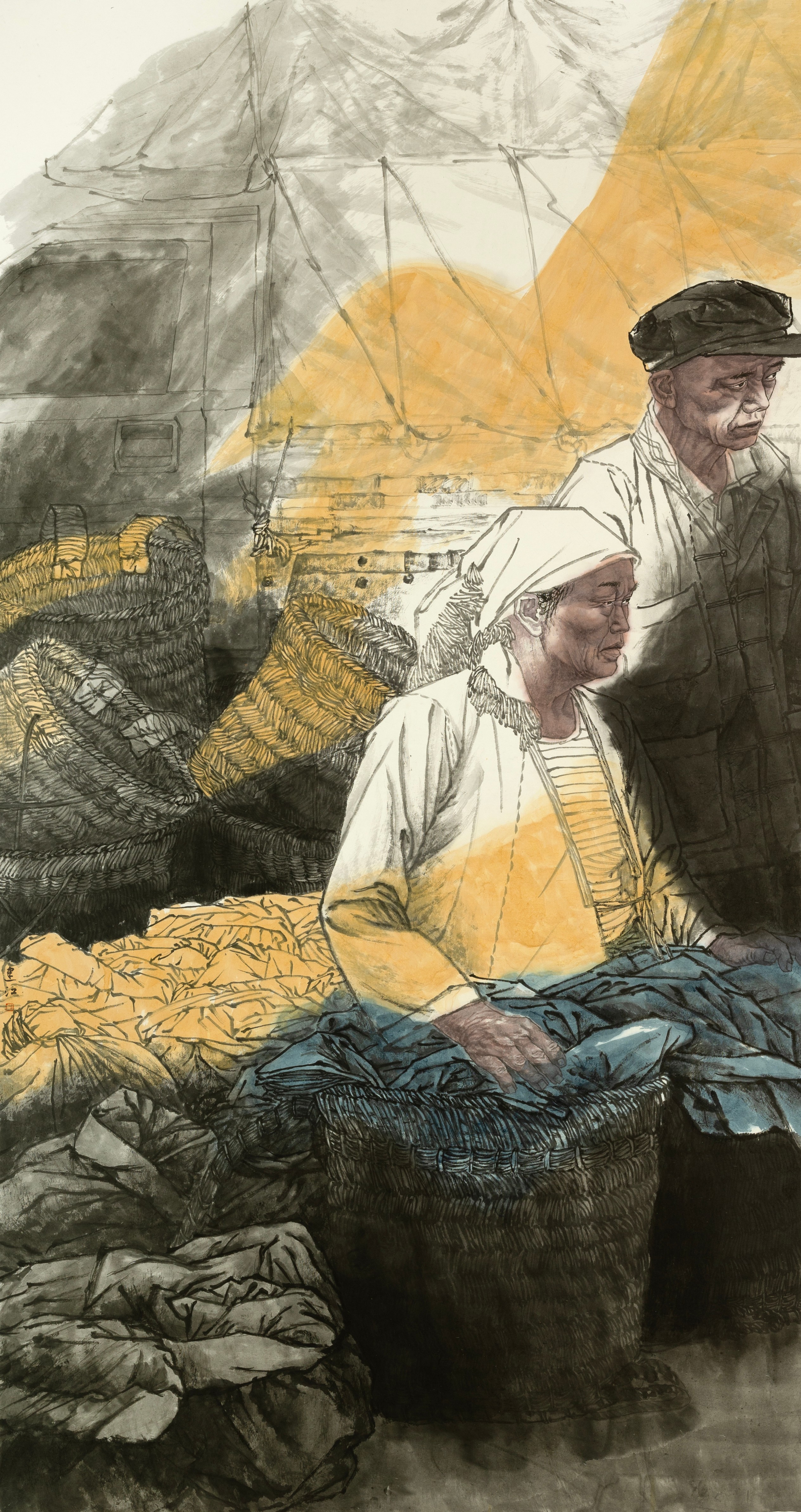 本作品以广西隆林德峨偏苗妇女赶圩场景为题材,作品以“劳动尊严”与“文化坚守”为双重主题,借队列式四位偏苗妇女形象暗喻文化传承,借助晨雾与朝晖的光影设计,将日常劳作升华为具有仪式感的文化隐喻。艺术表现上,创新采用未提炼靛青泥与矿物颜料混合的技法,探索传统染料的当代应用,营造斑驳厚重的岩彩肌理与历史纵深感,通过“在地性”材质创新与符号转译,以及光影的运用,为中国人物画注入现代语言。