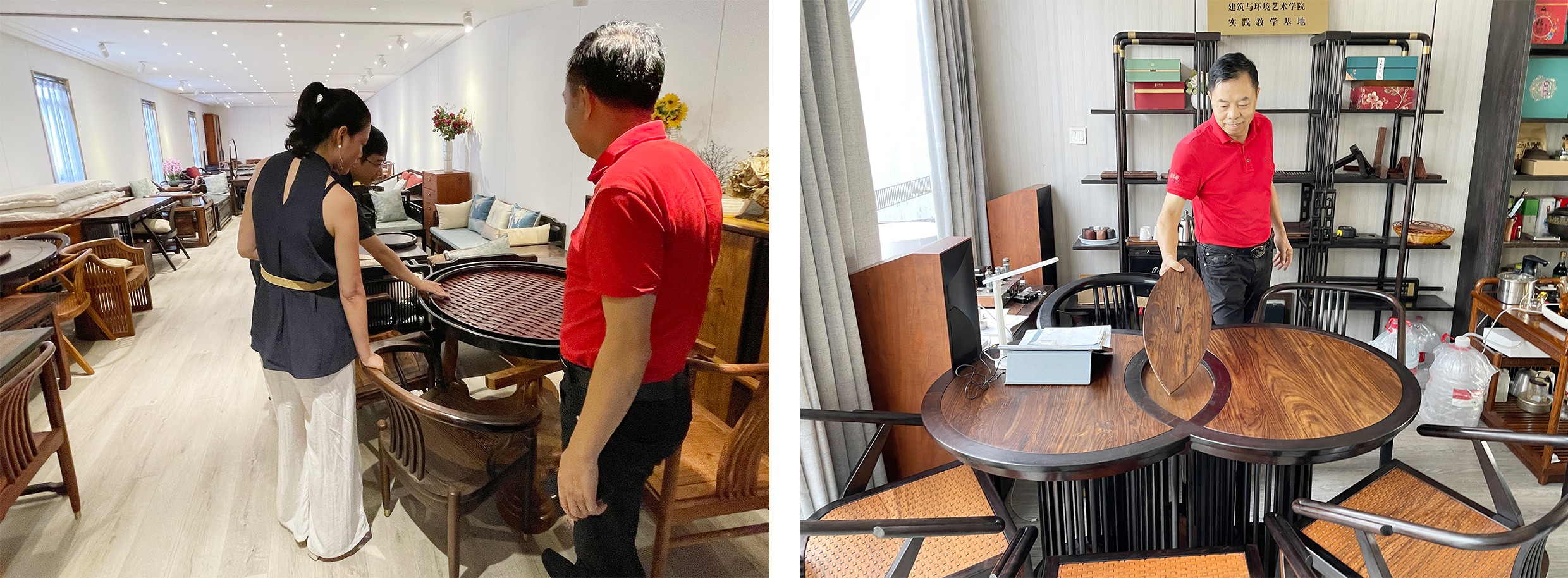 走访过程中,学院一行参观了工作室的红木家具展示区和生产车间,张世轩现场演示榫卯结构制作工艺与新产品。周家辞老师认为,将实地参观学习纳入实践课程,利于学生掌握传统与现代技术融合之道。未来,学院将定期组织学生参与实践活动,优秀者可获实习机会;张世轩大师将开展讲座并参与课程开发。孙晓莹副主任总结称,此次走访是深化“产教融合”的重要实践,为学院教学改革、服务区域文化创意产业发展提供新思路,未来学院将持续搭建协同创新平台,培养复合型设计人才。(周家辞/摄