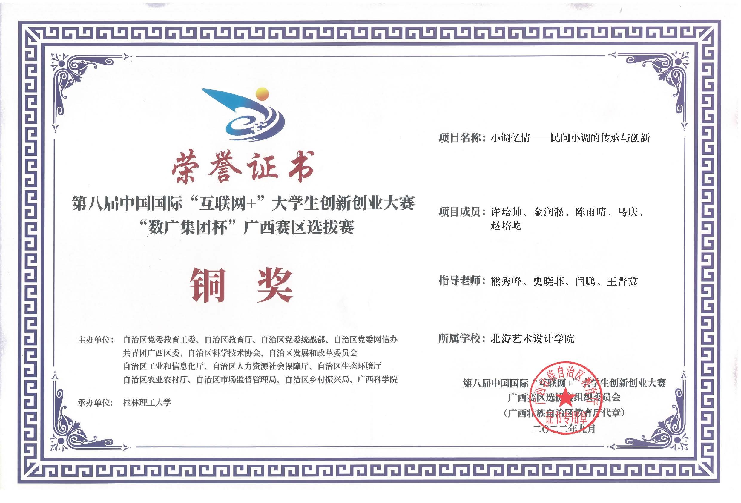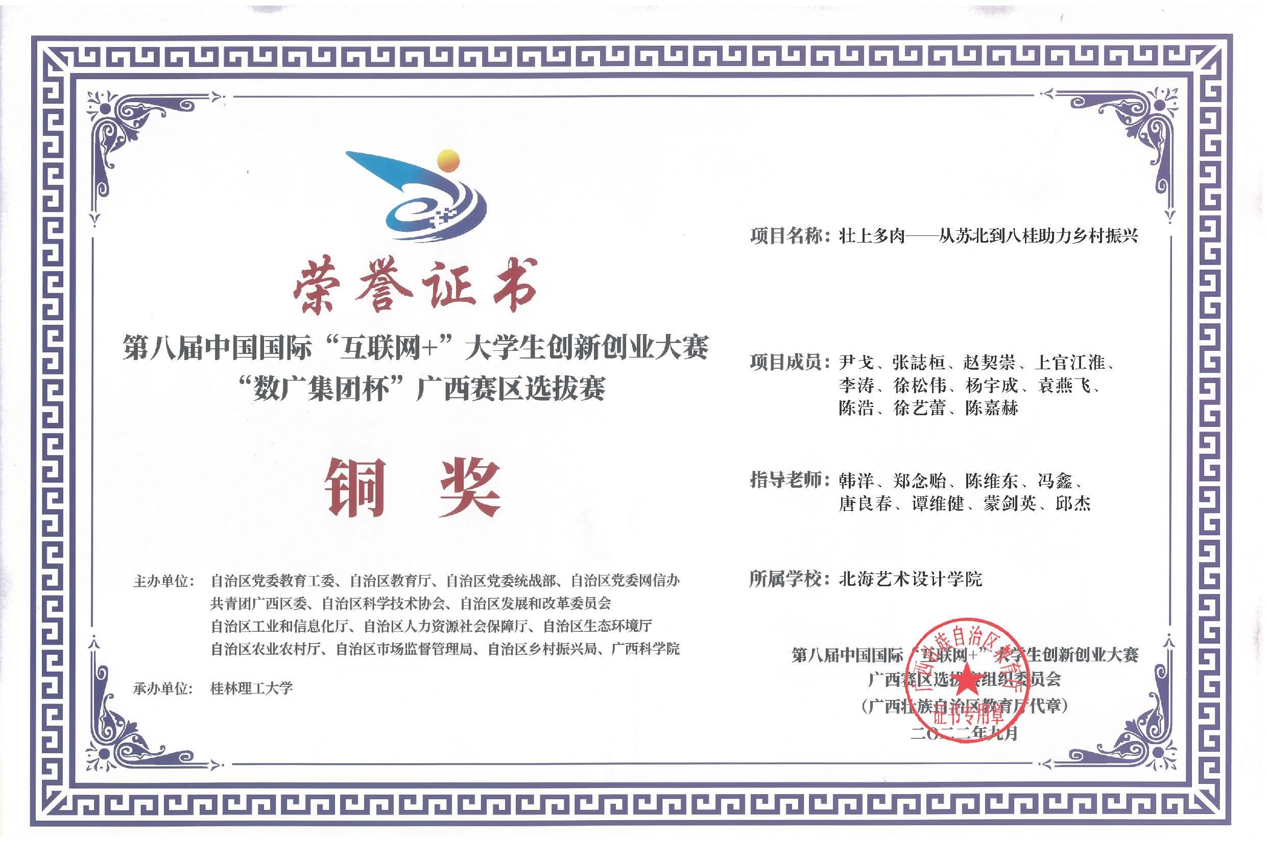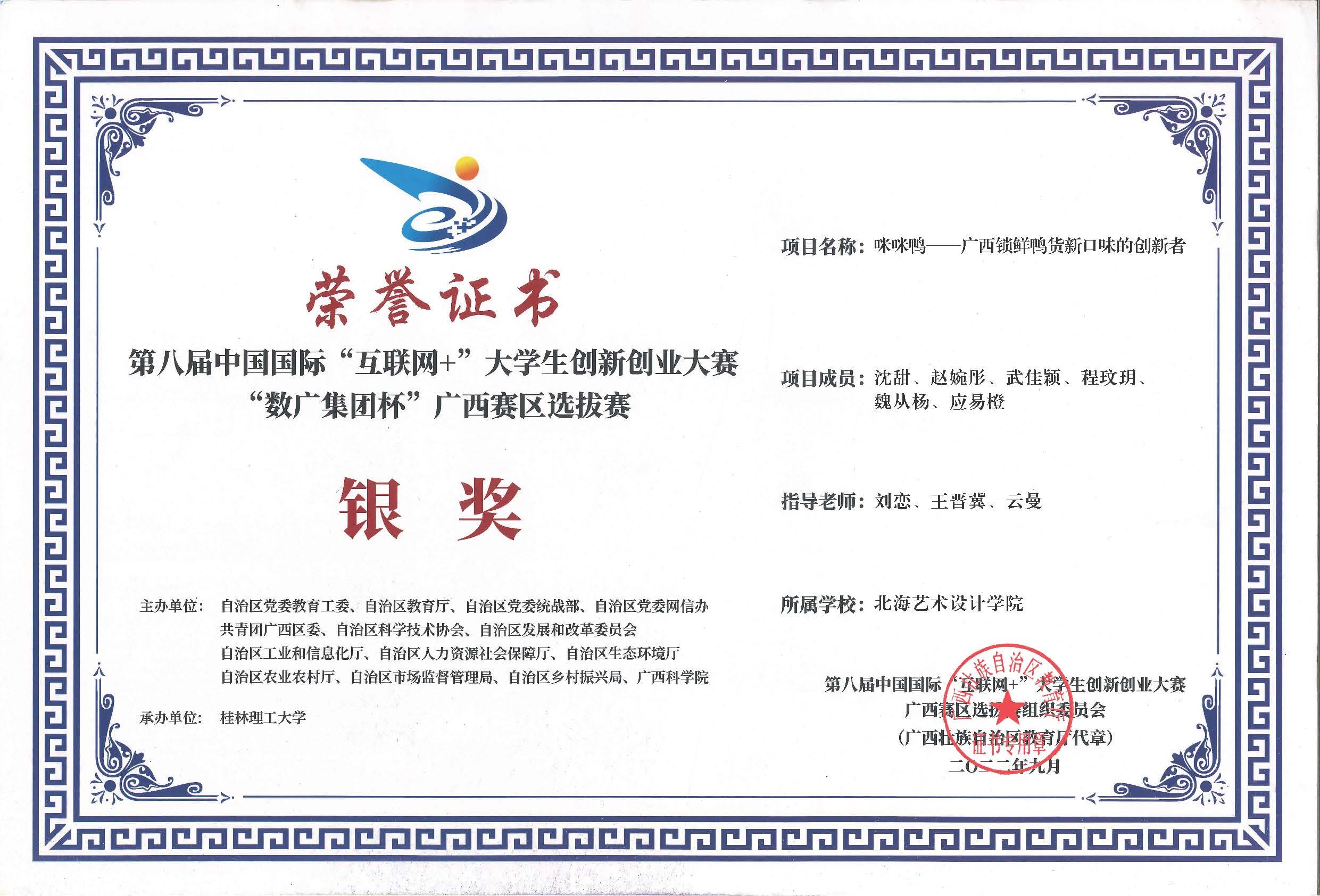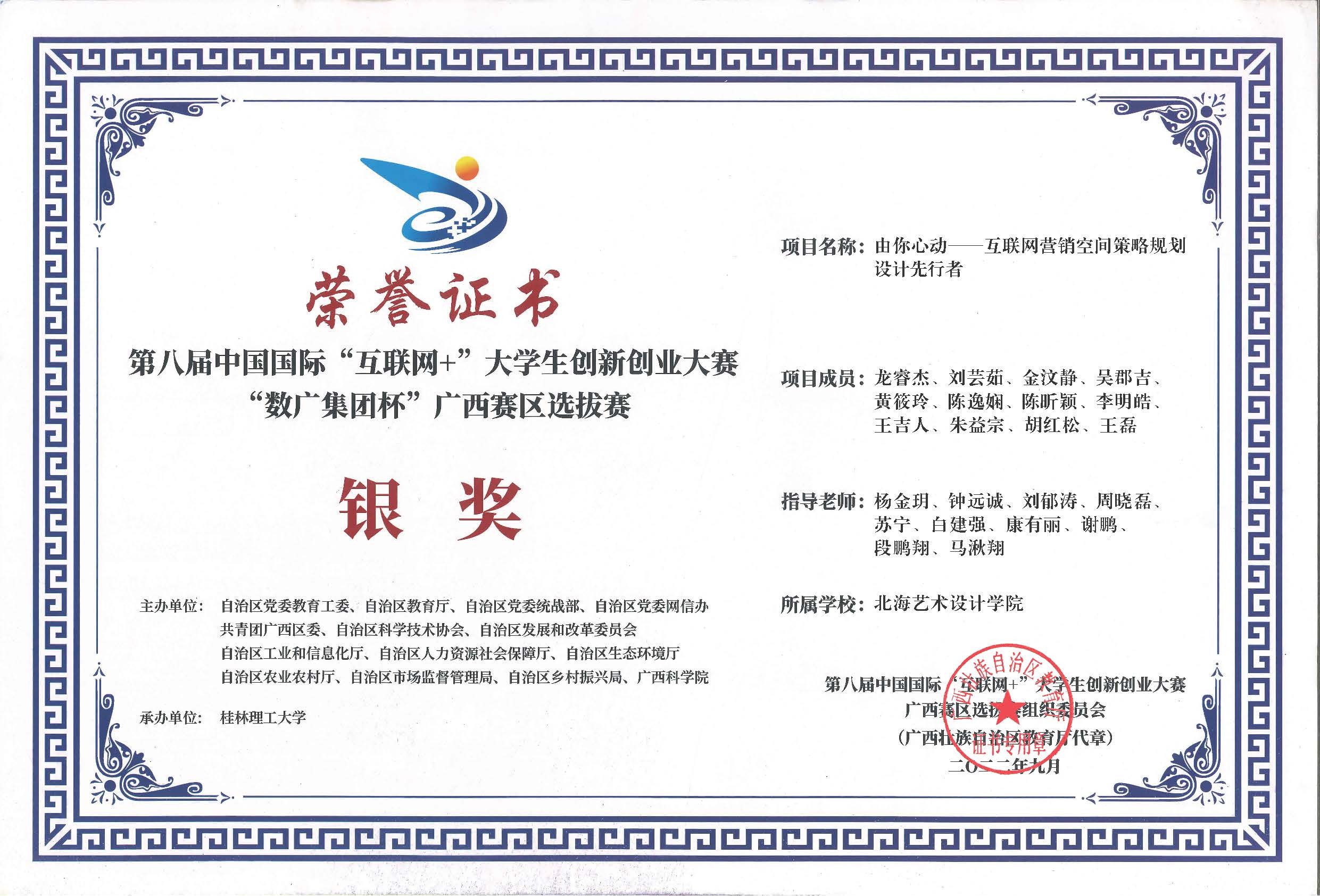 第八届中国国际互联网+大赛广西区获奖证书