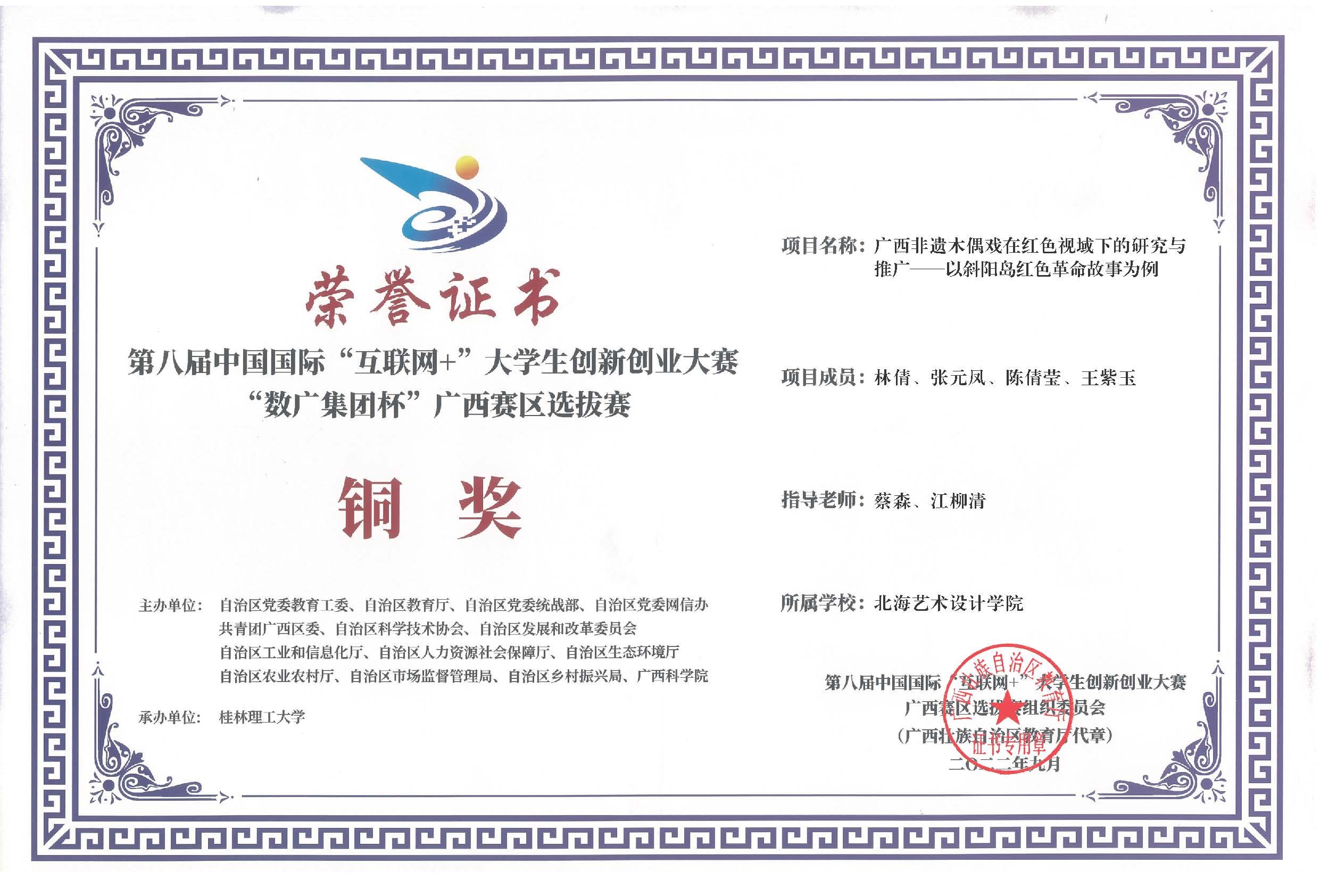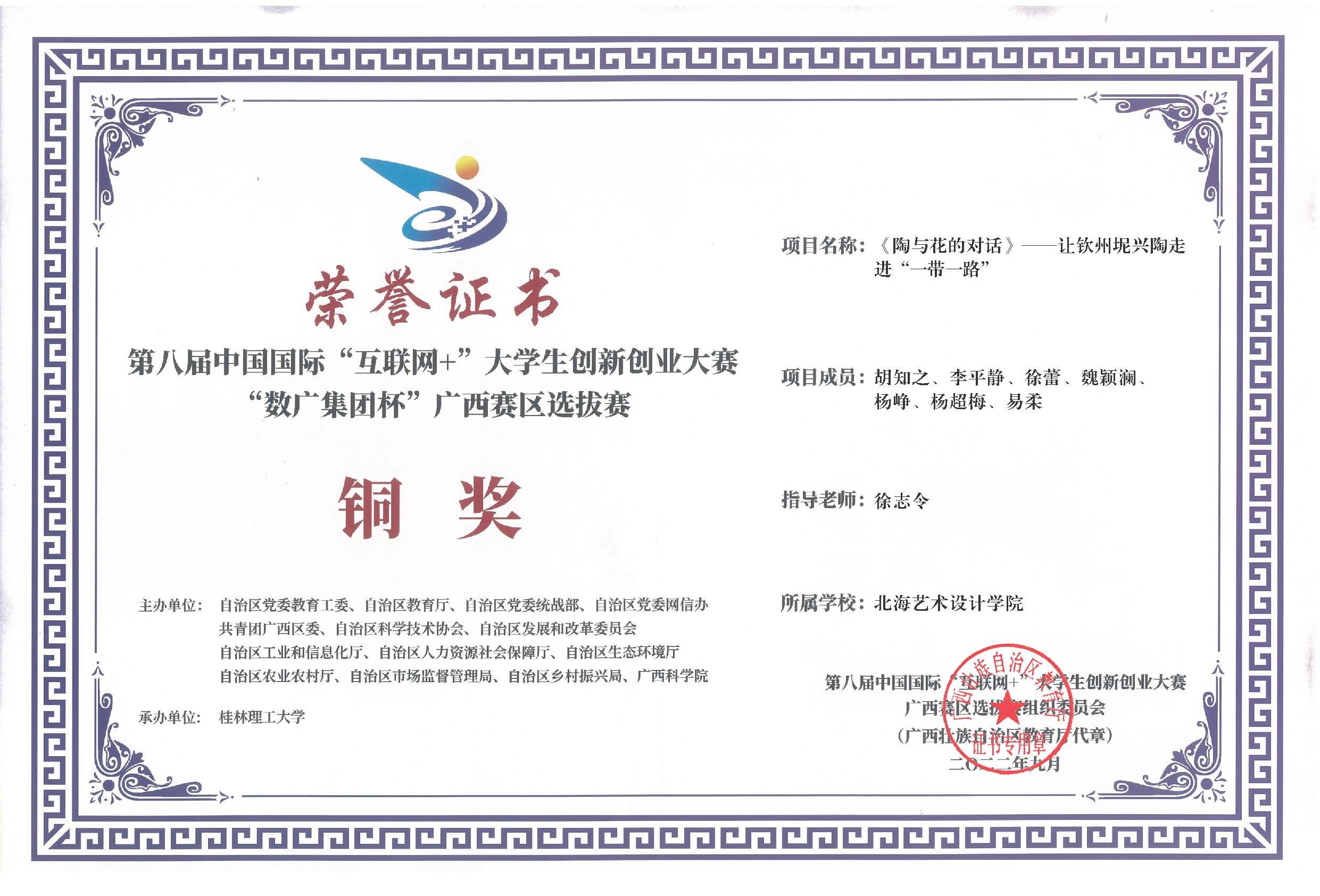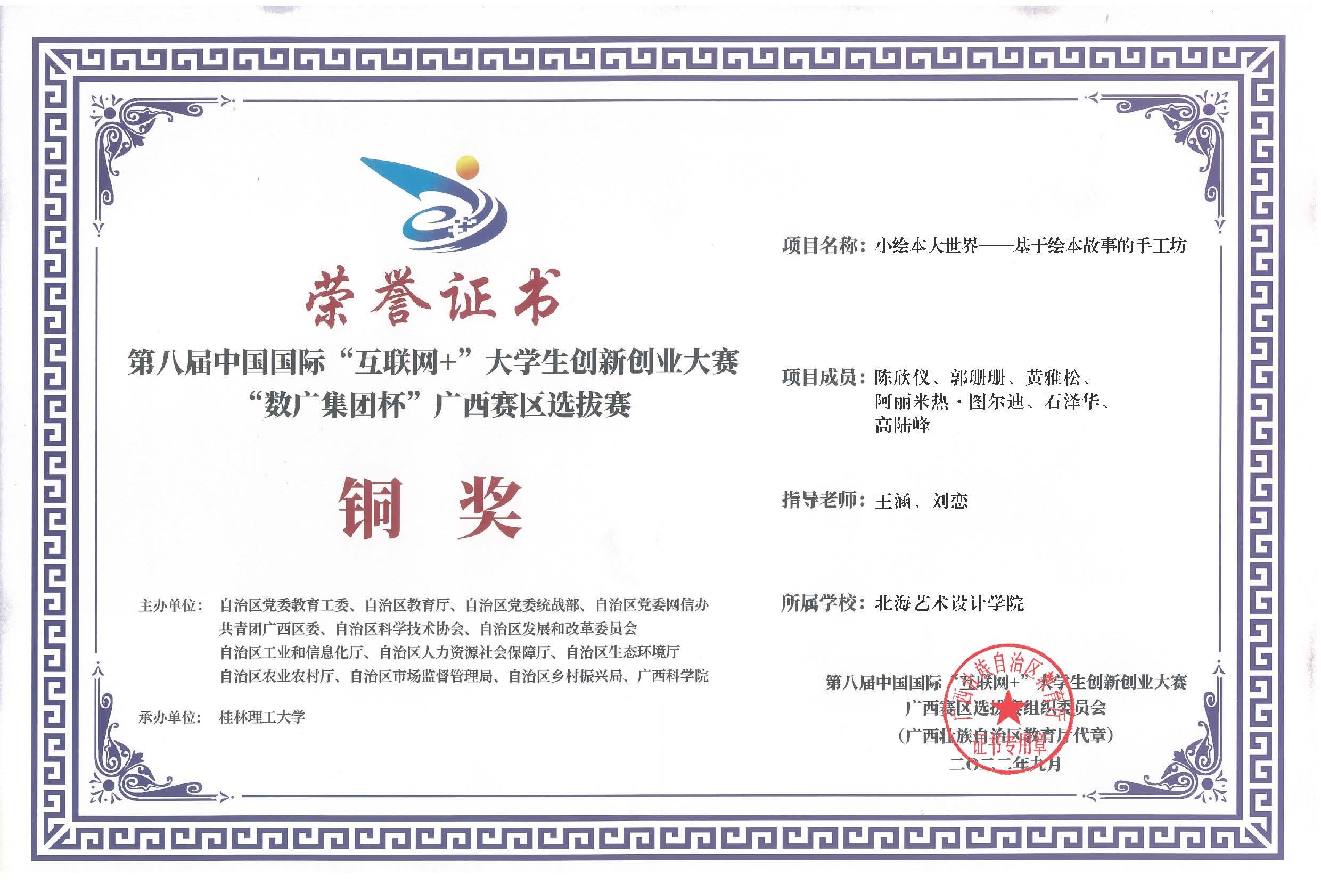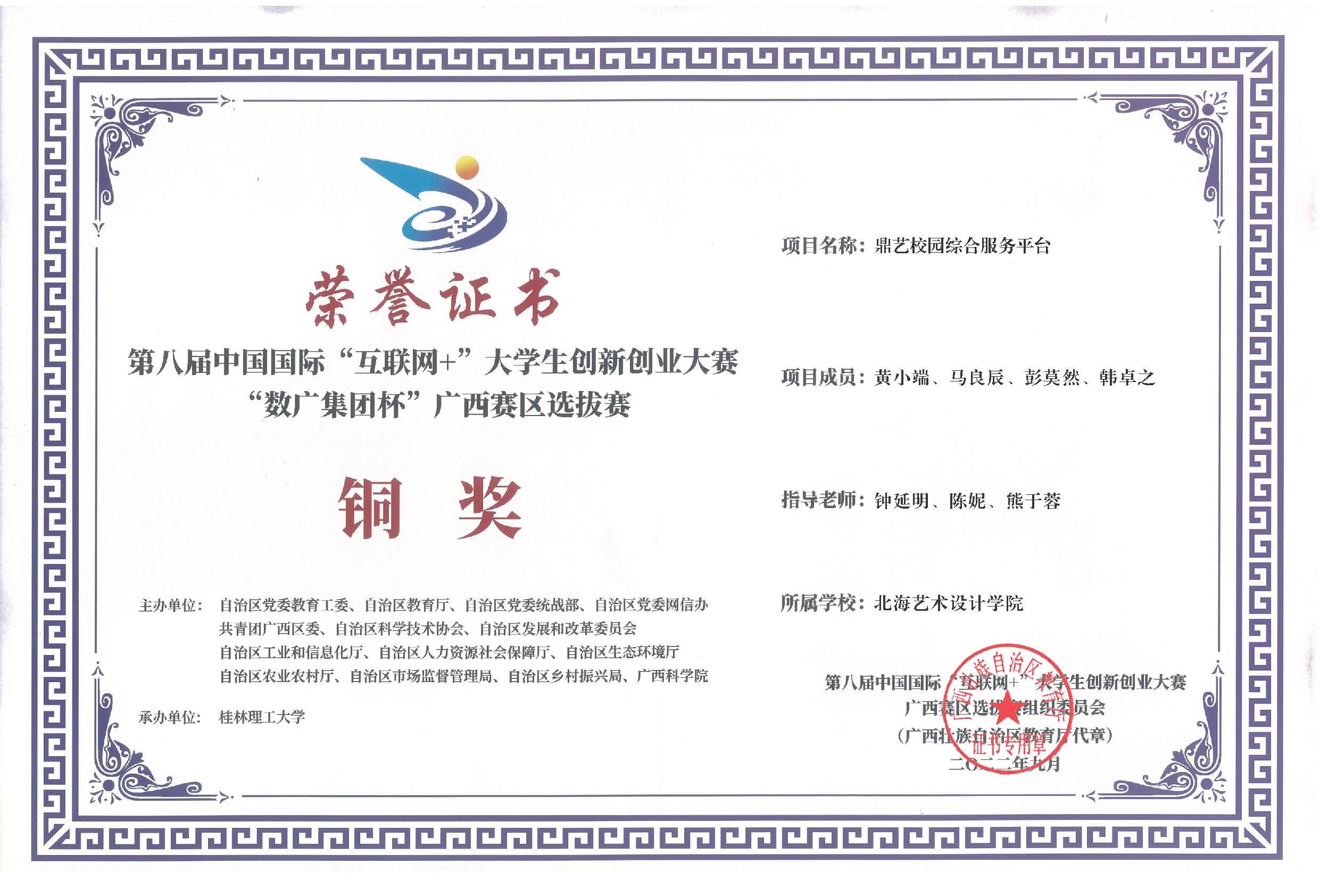 第八届中国国际互联网+大赛广西区获奖证书