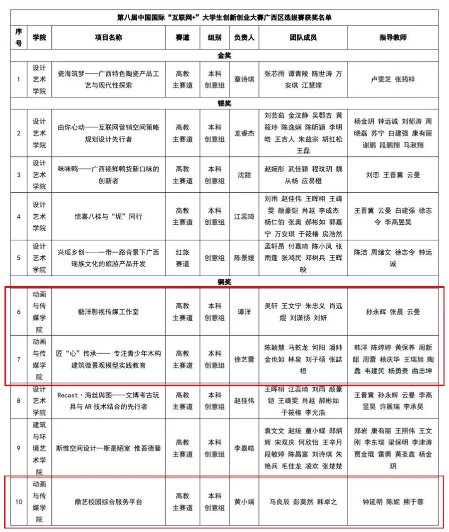 接下来,学校将总结比赛经验,强化多方协同,持续深化创新创业教育改革,努力培养造就更多理想信念坚定、专业知识扎实、创新创业能力突出的艺术人才,为服务国家创新驱动发展战略和广西经济社会高质量发展贡献更多北艺力量。