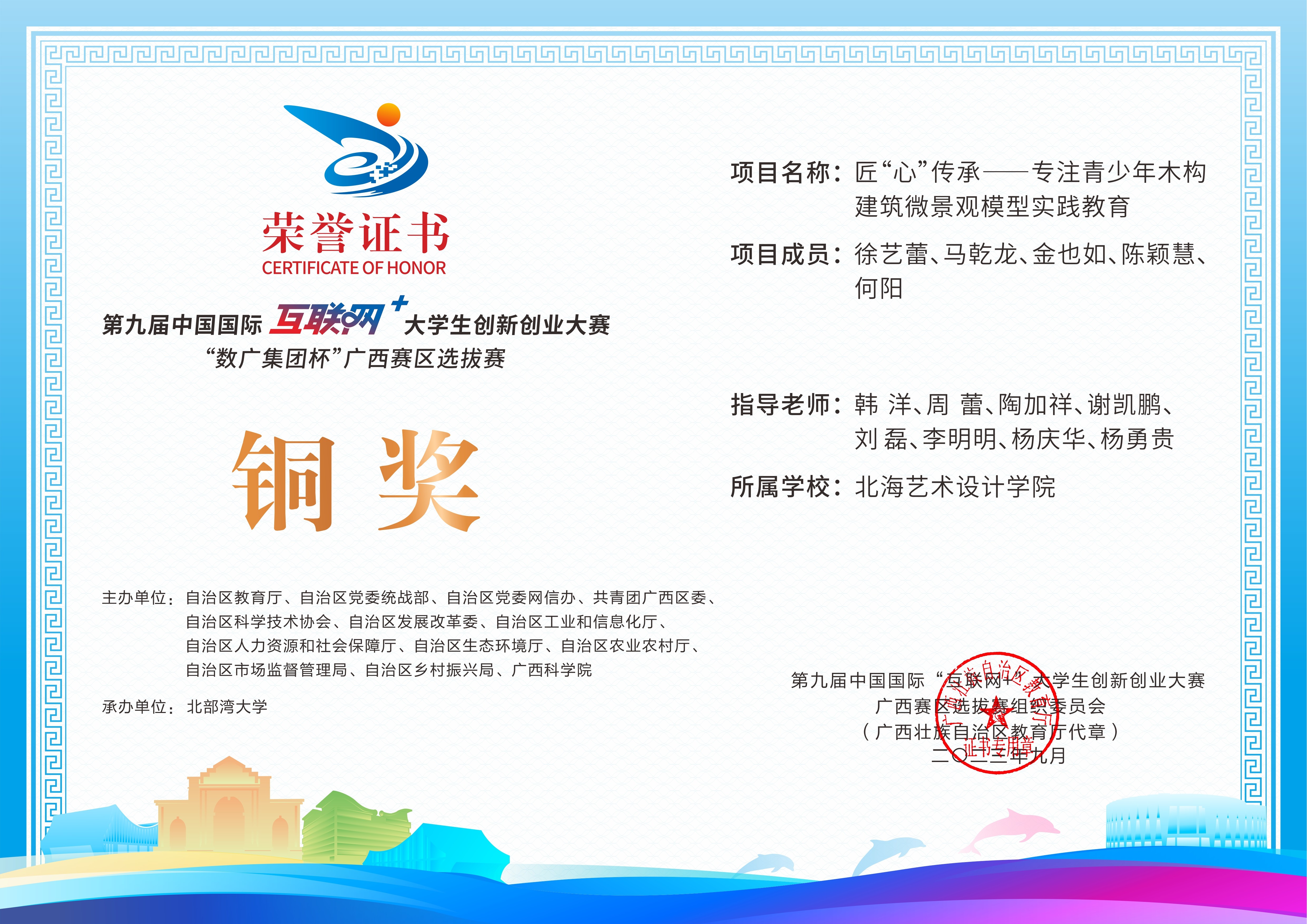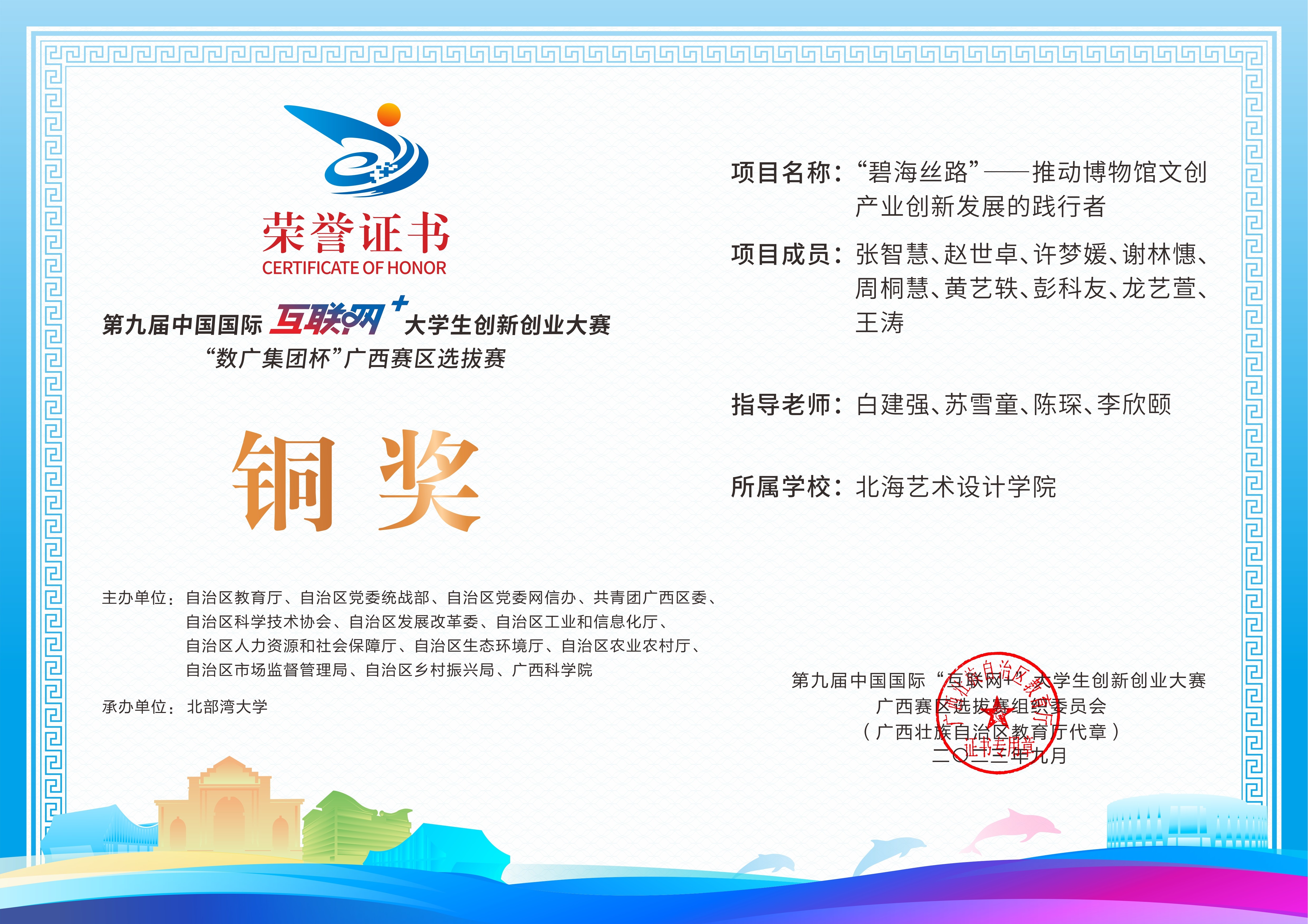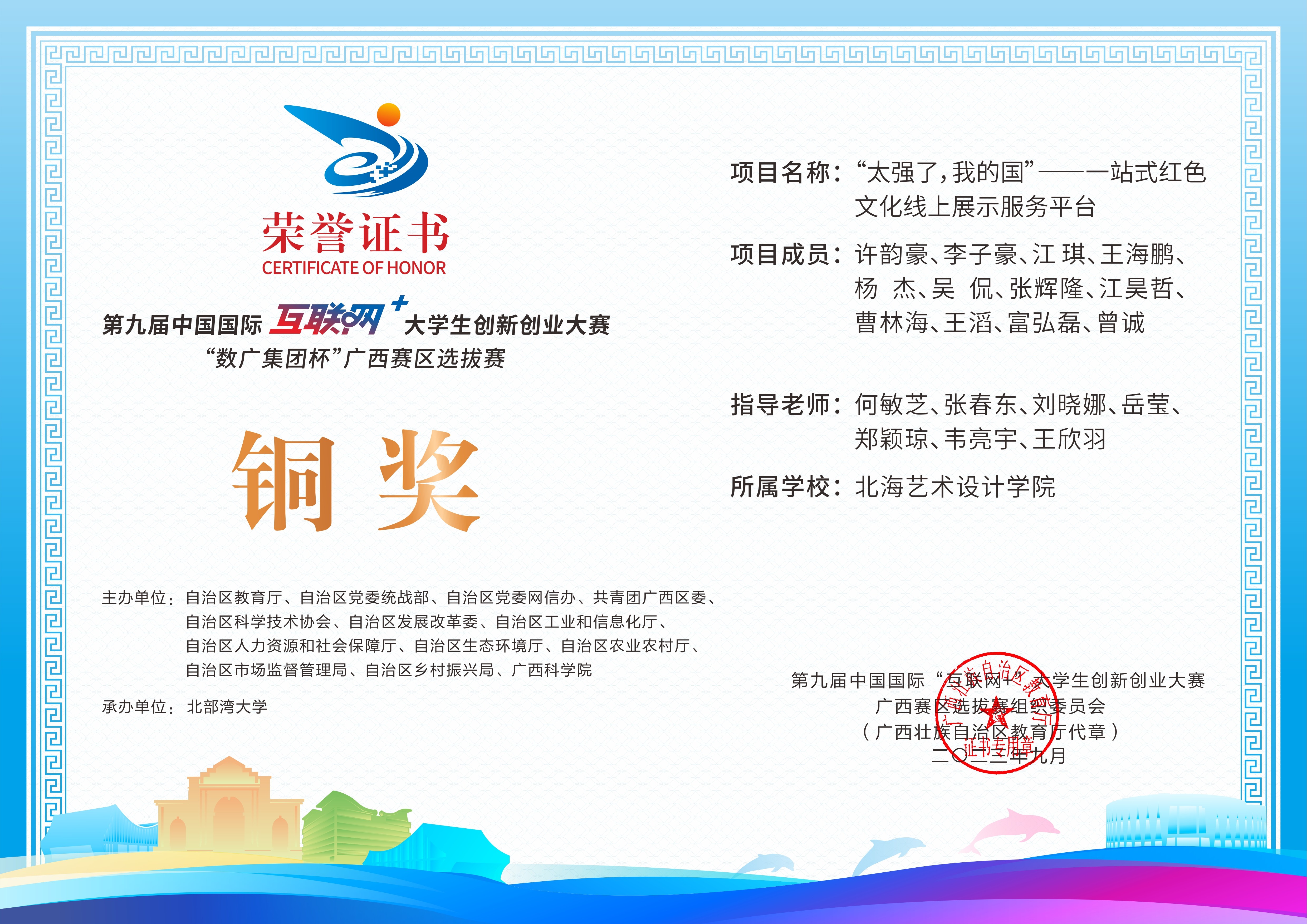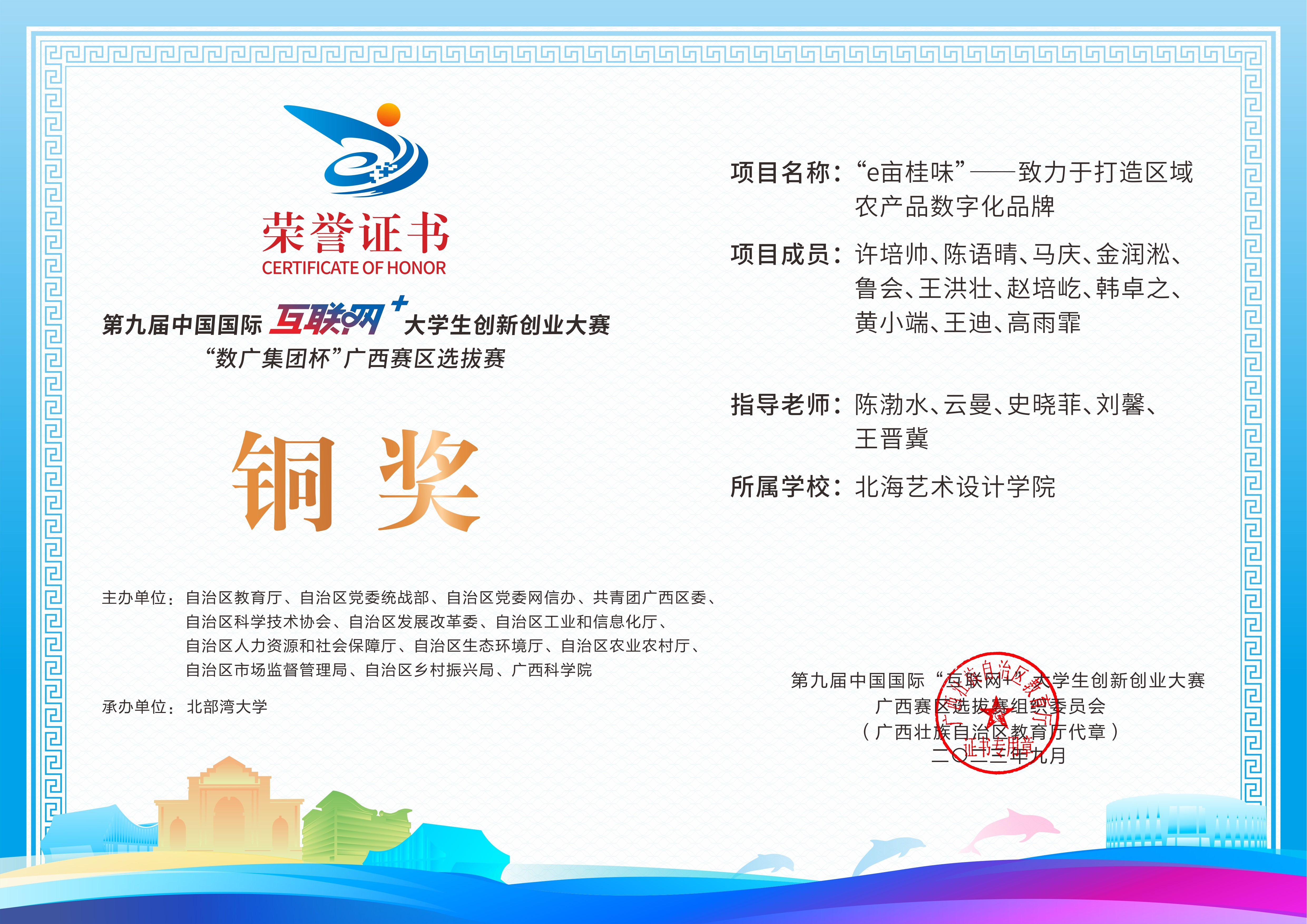 第九届中国国际互联网+大学生创新创业大赛“数广集团杯”广西赛区选拔赛获奖证书