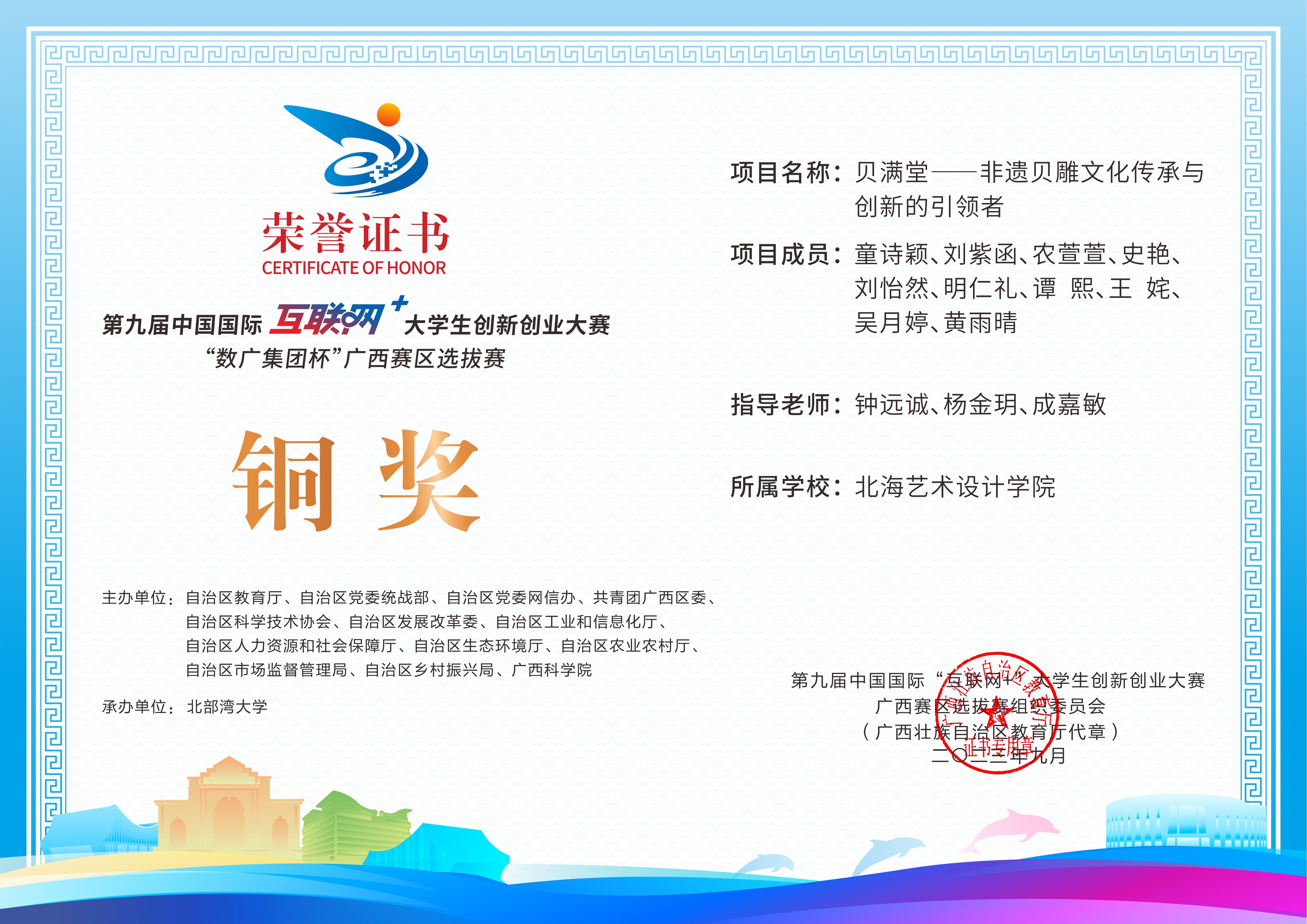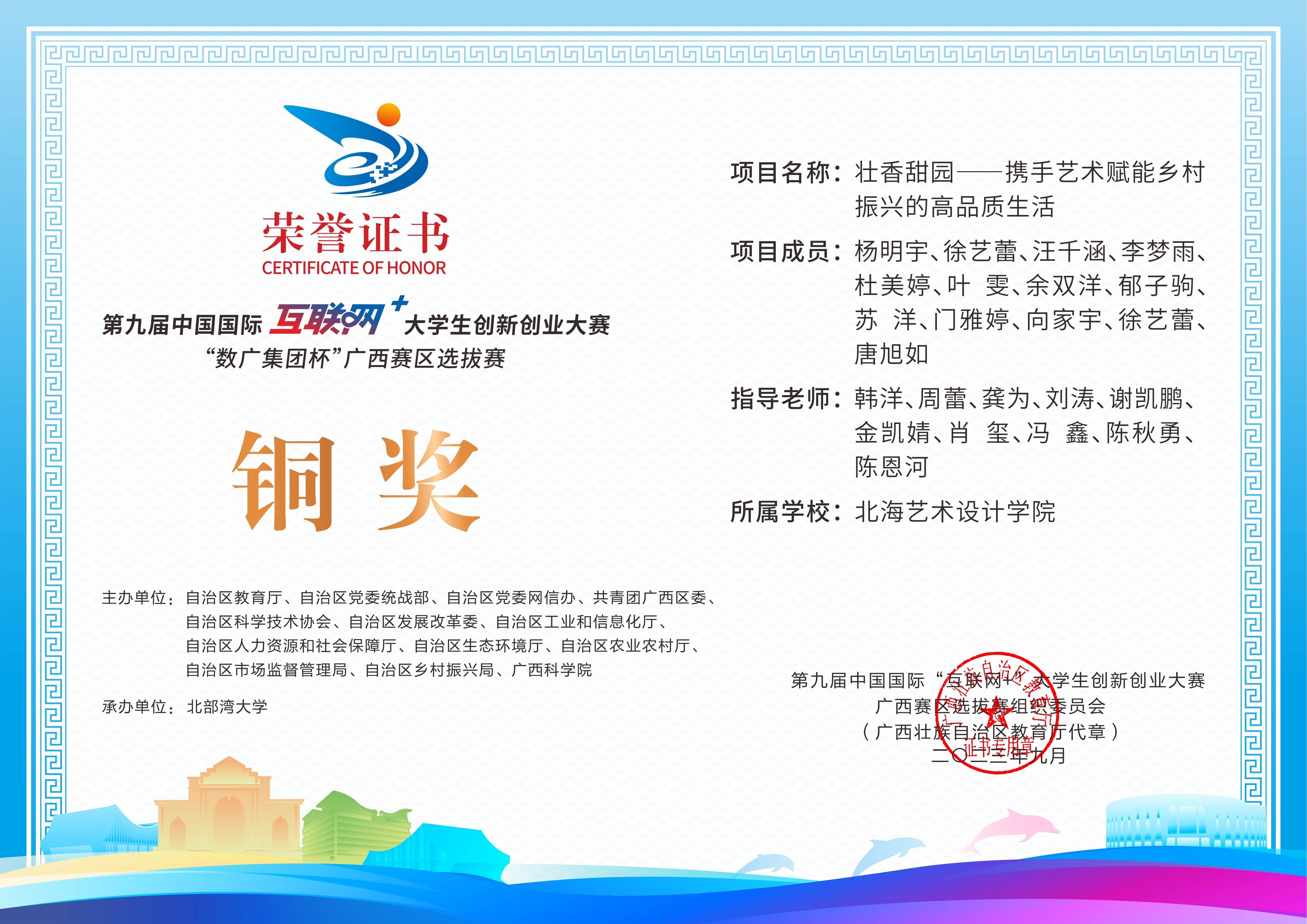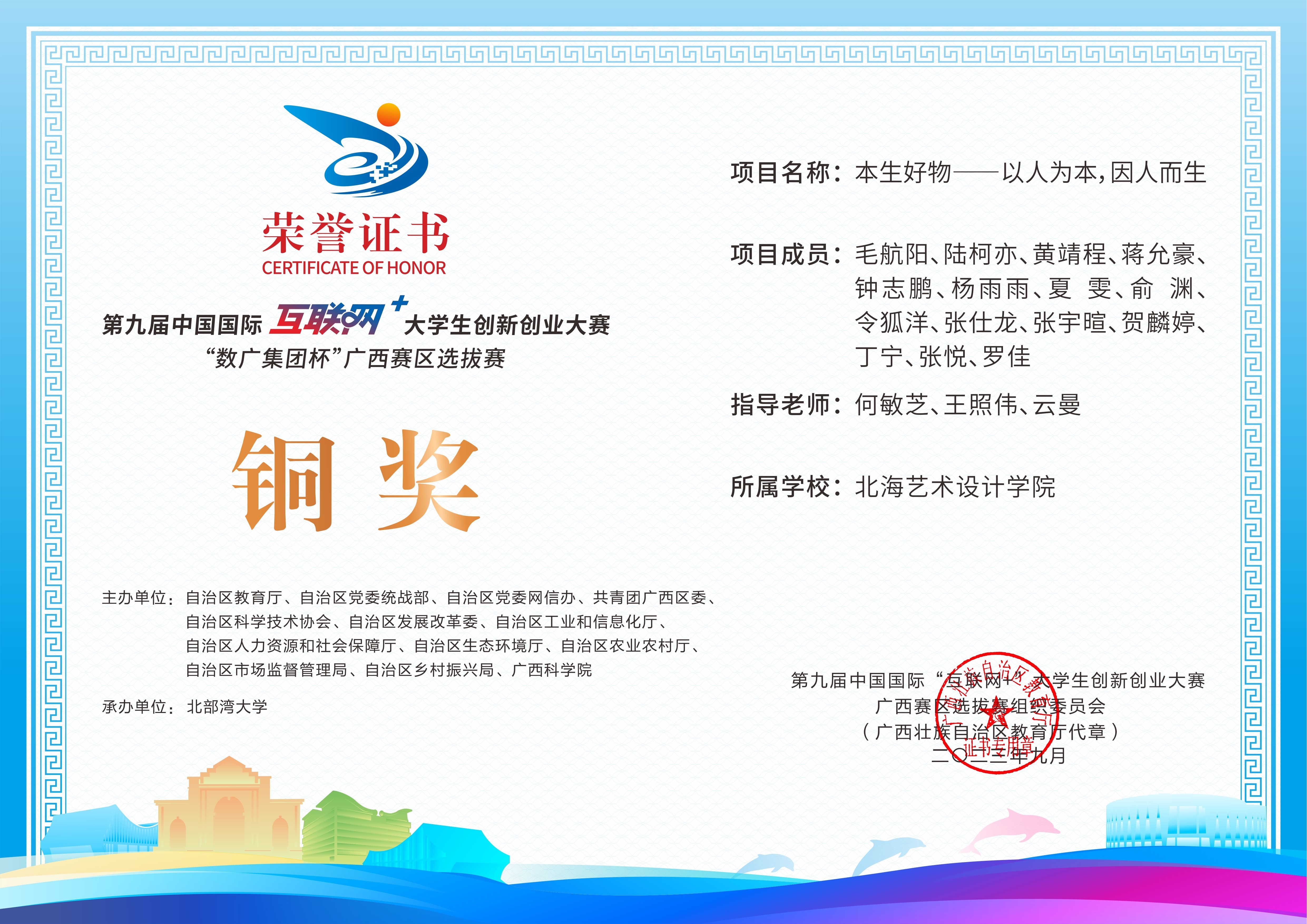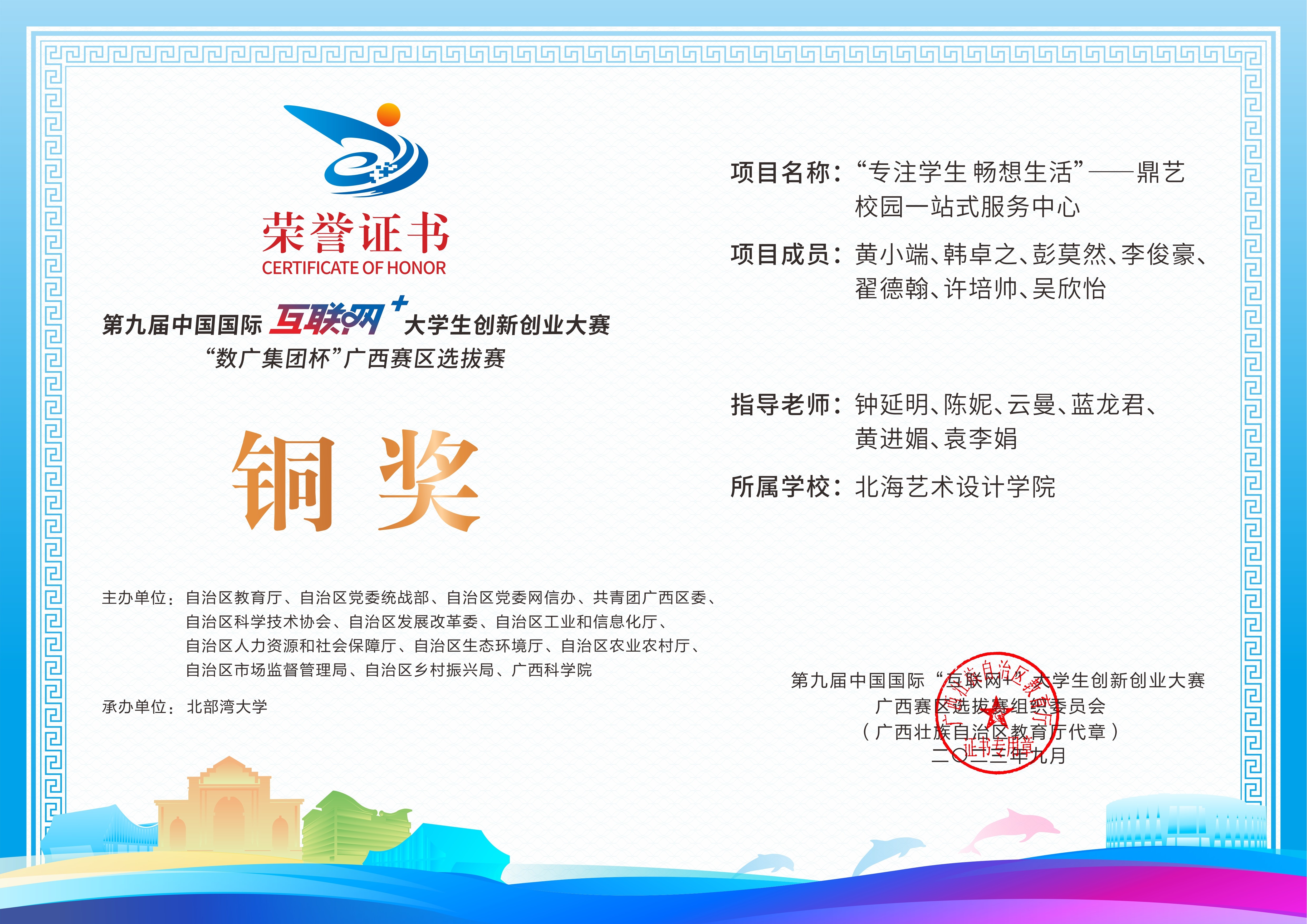 第九届中国国际互联网+大学生创新创业大赛“数广集团杯”广西赛区选拔赛获奖证书