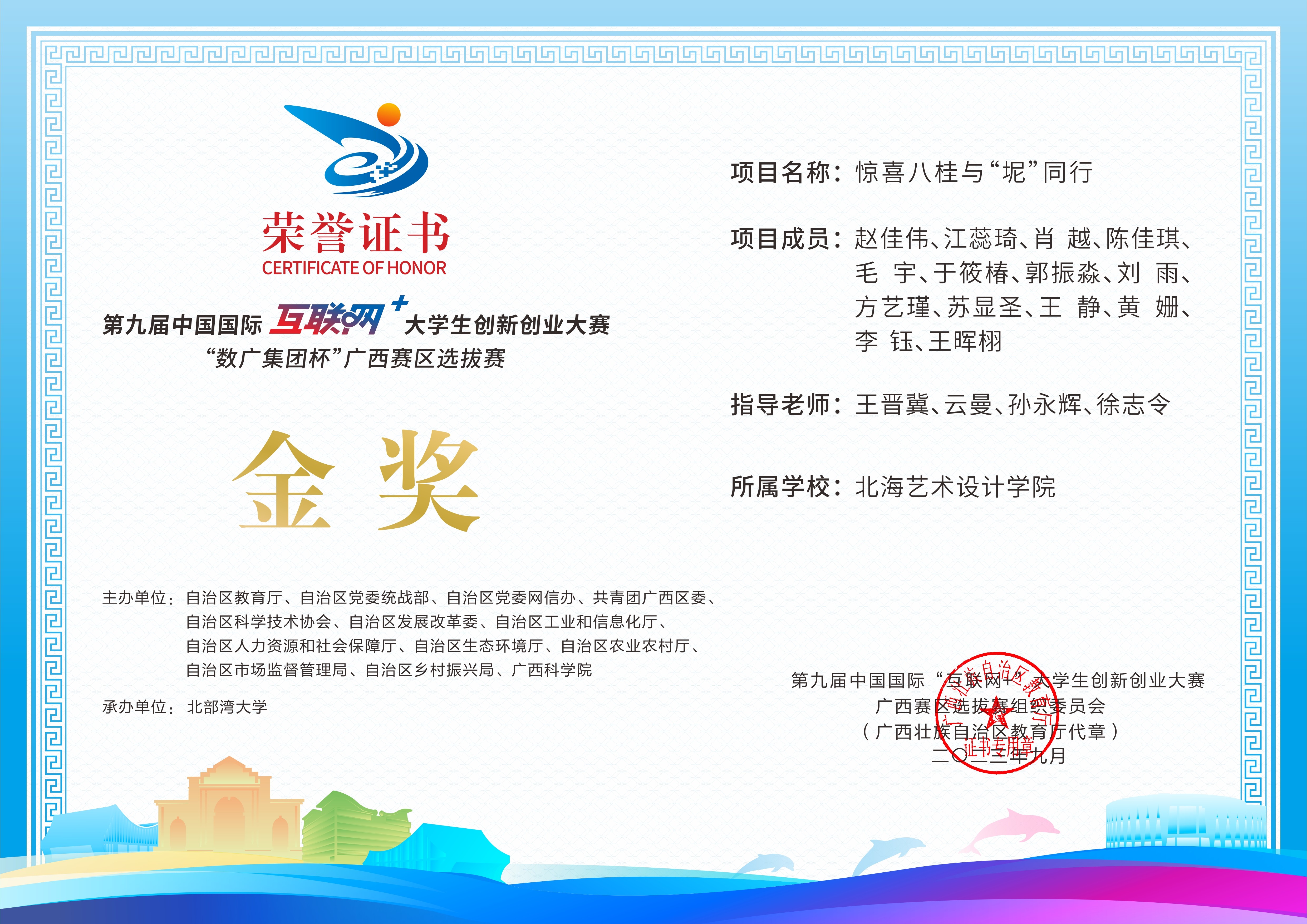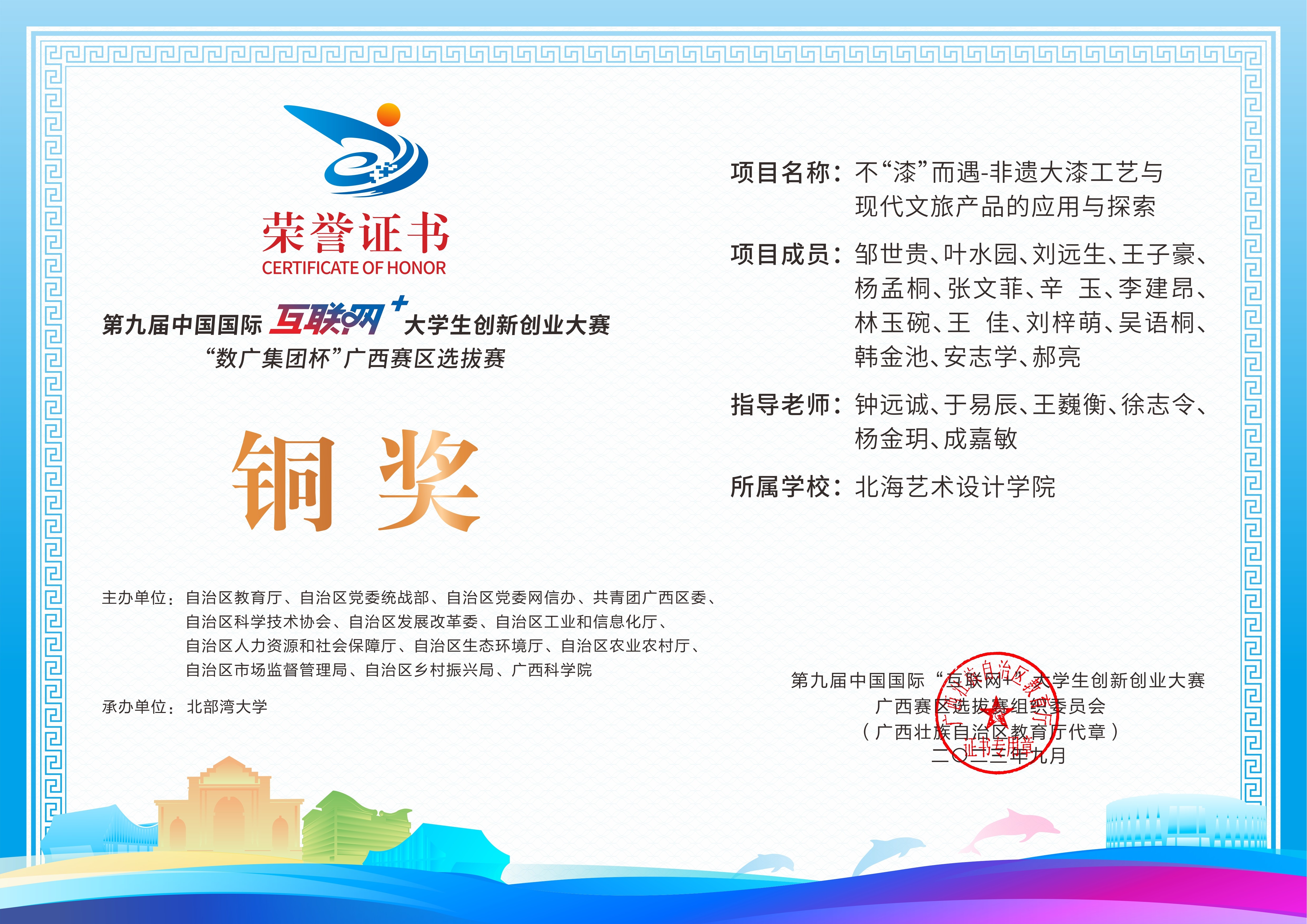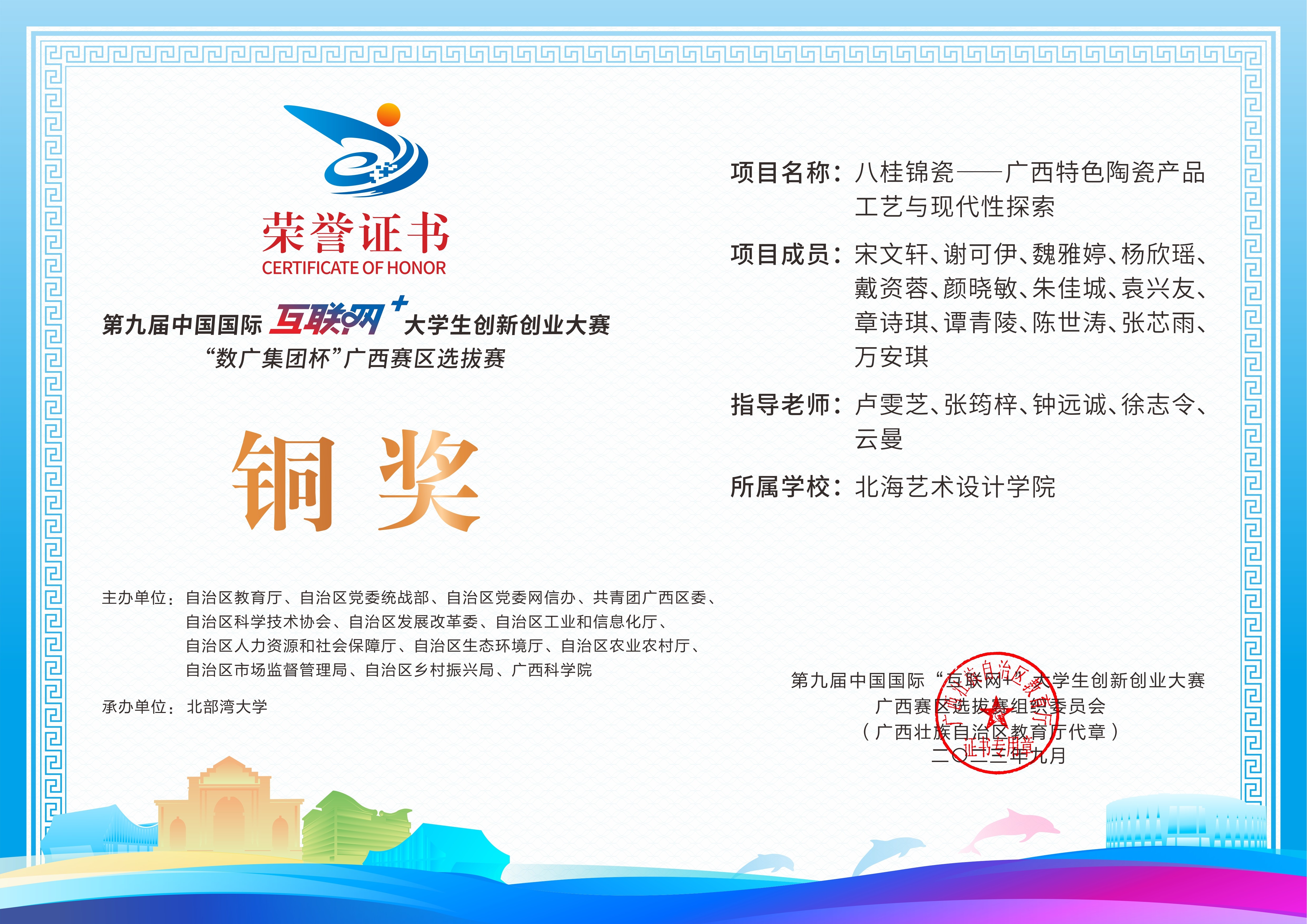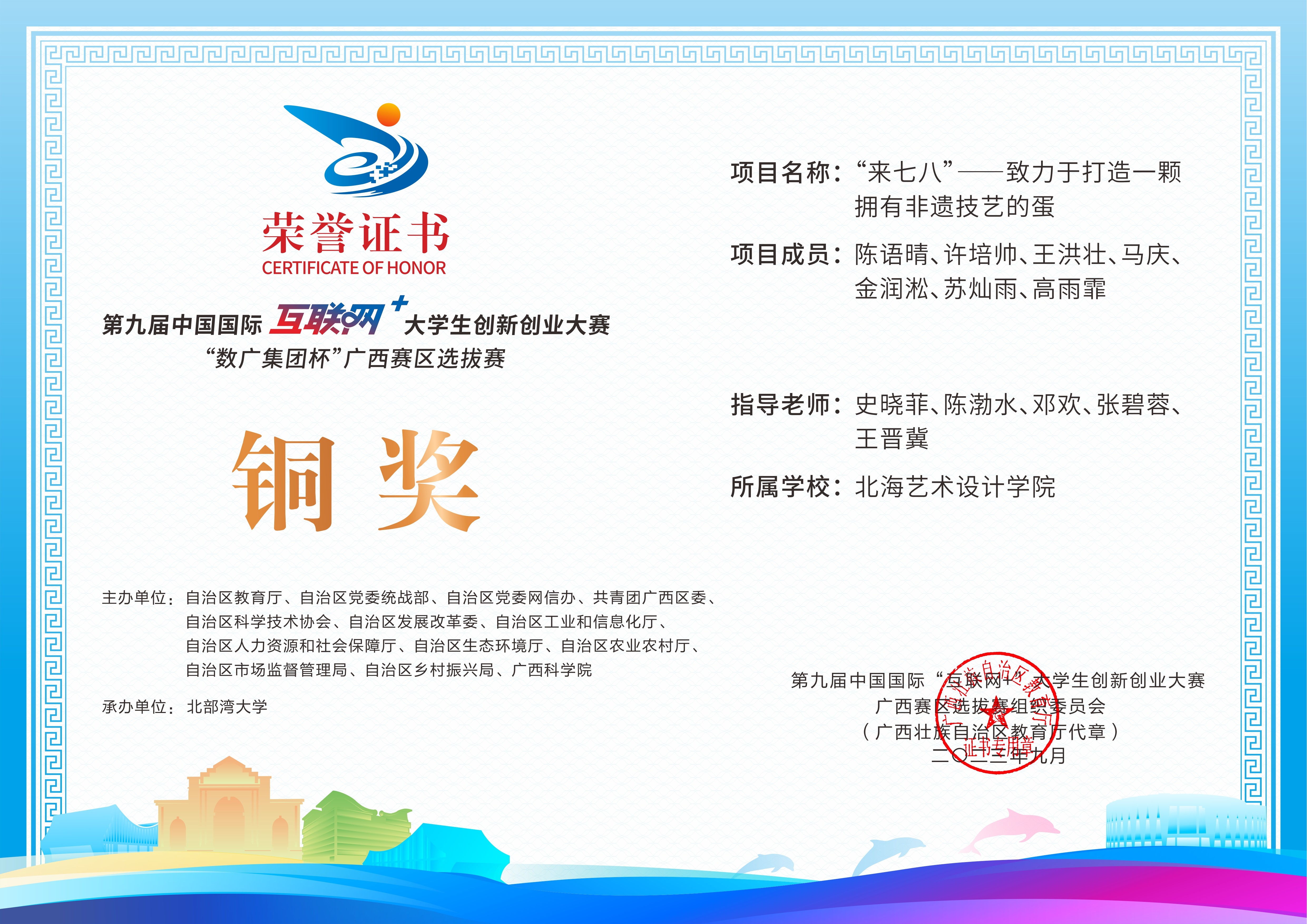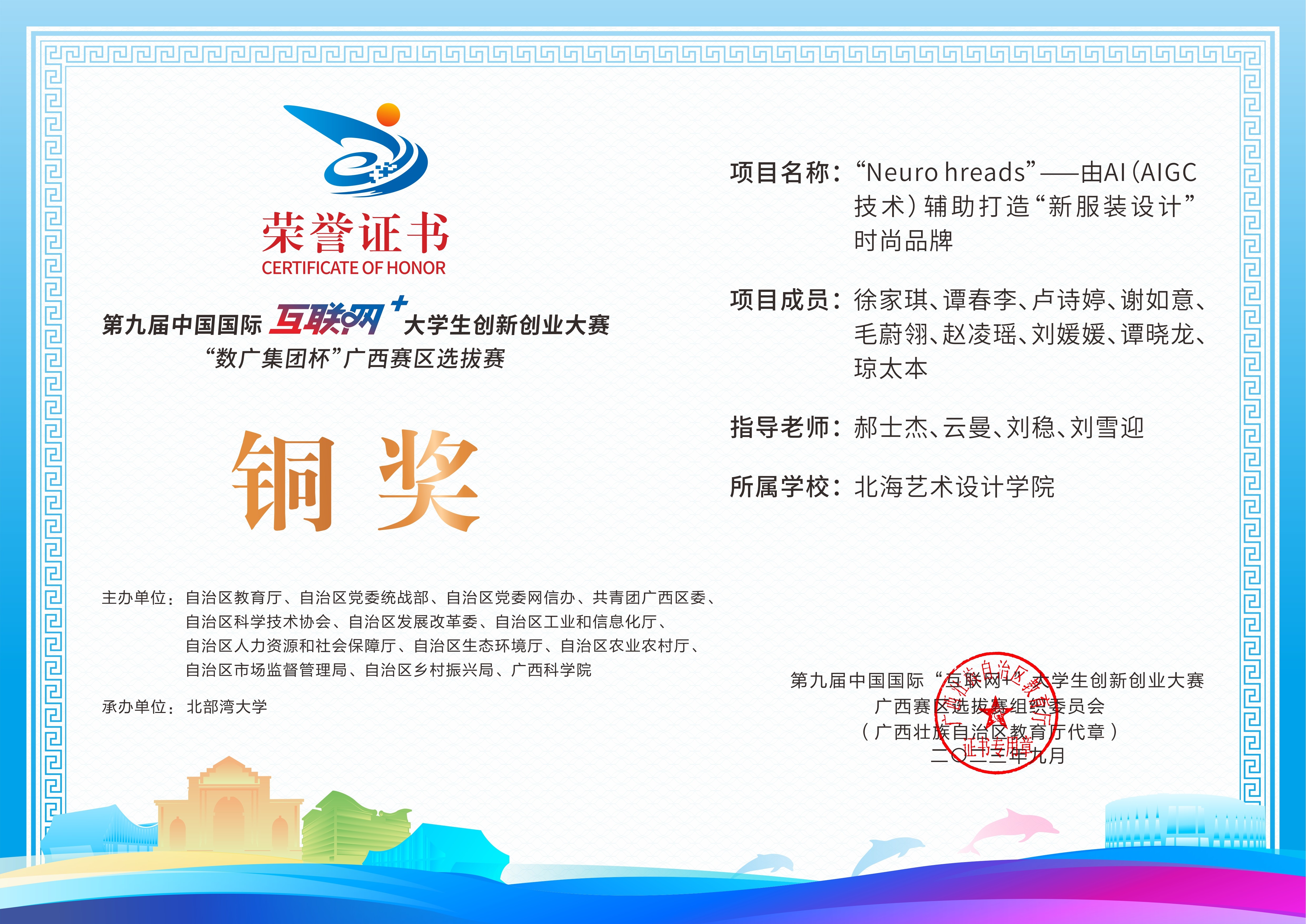 第九届中国国际互联网+大学生创新创业大赛“数广集团杯”广西赛区选拔赛获奖证书