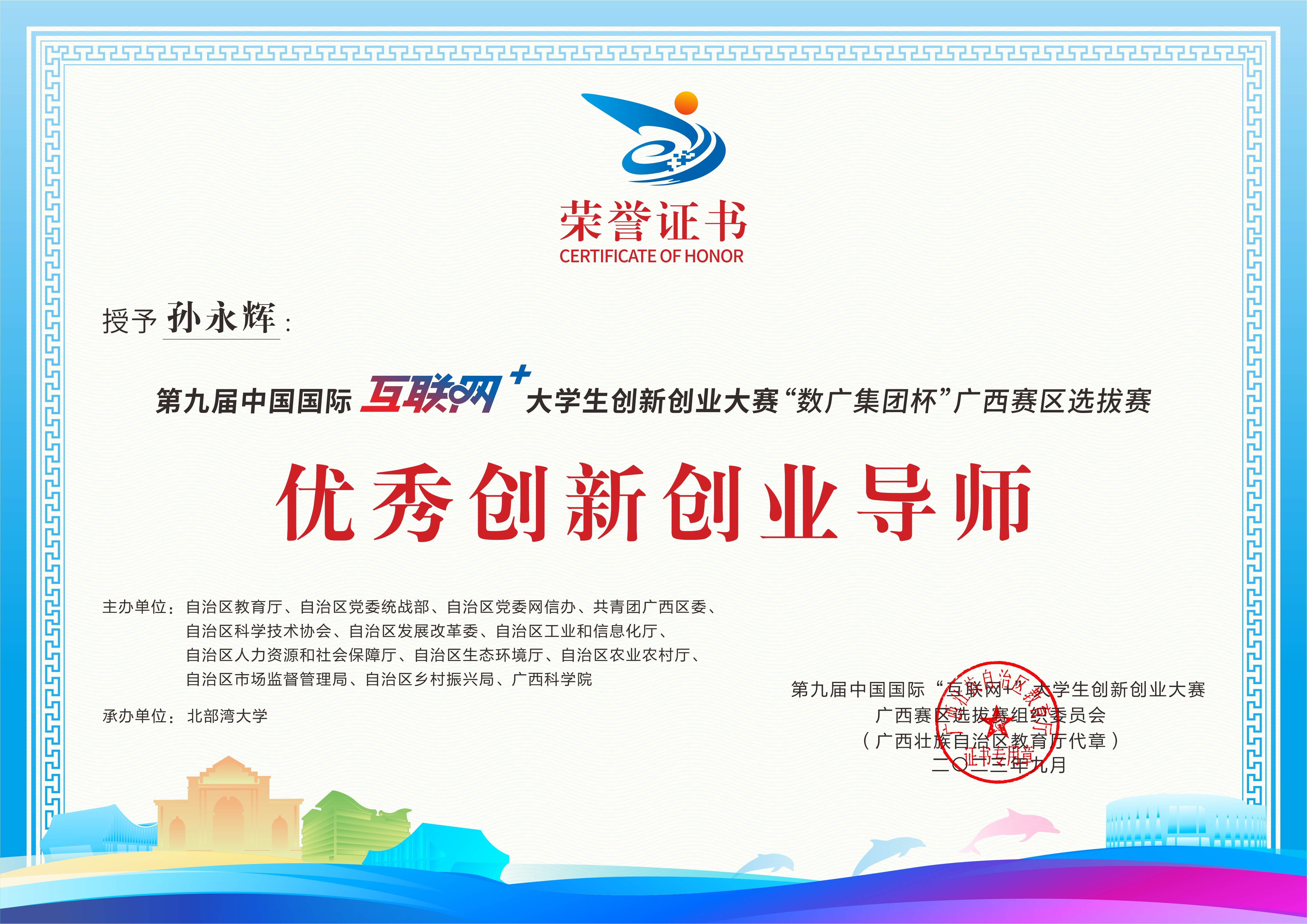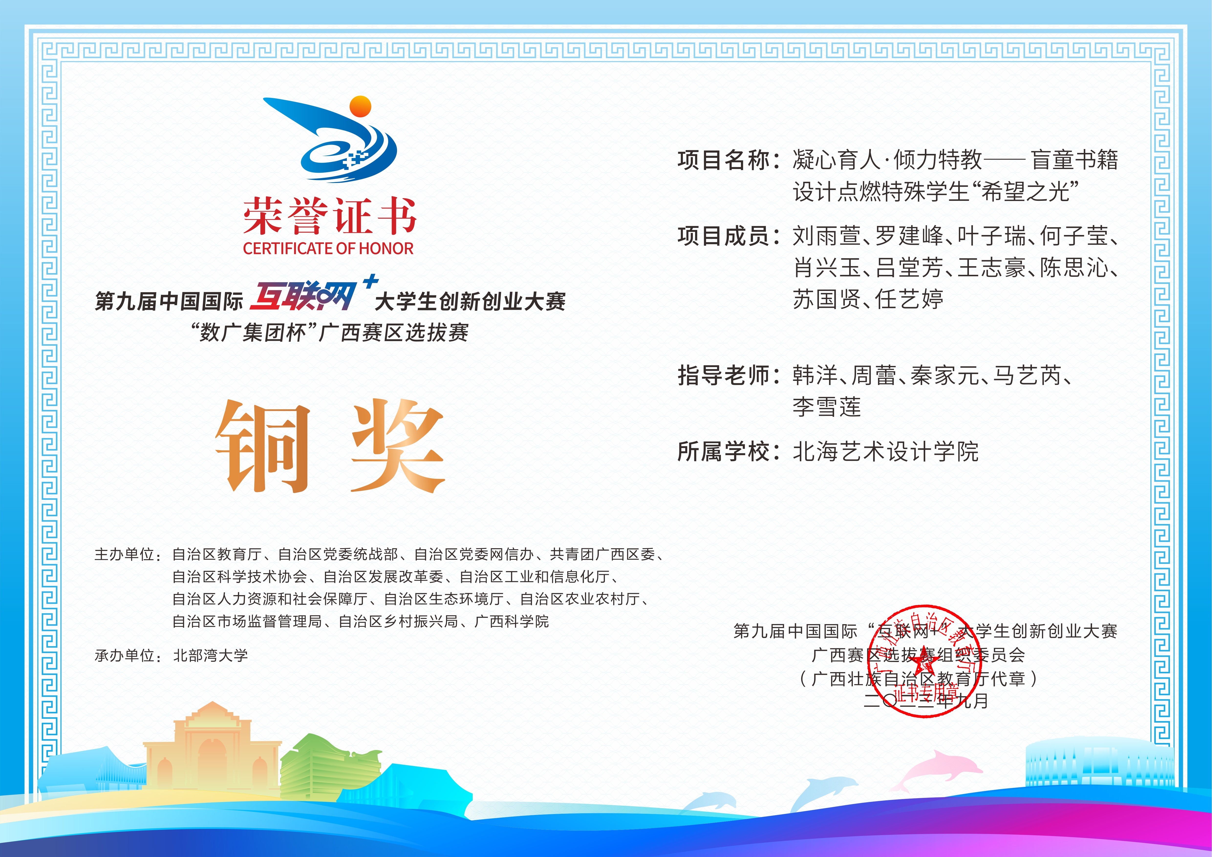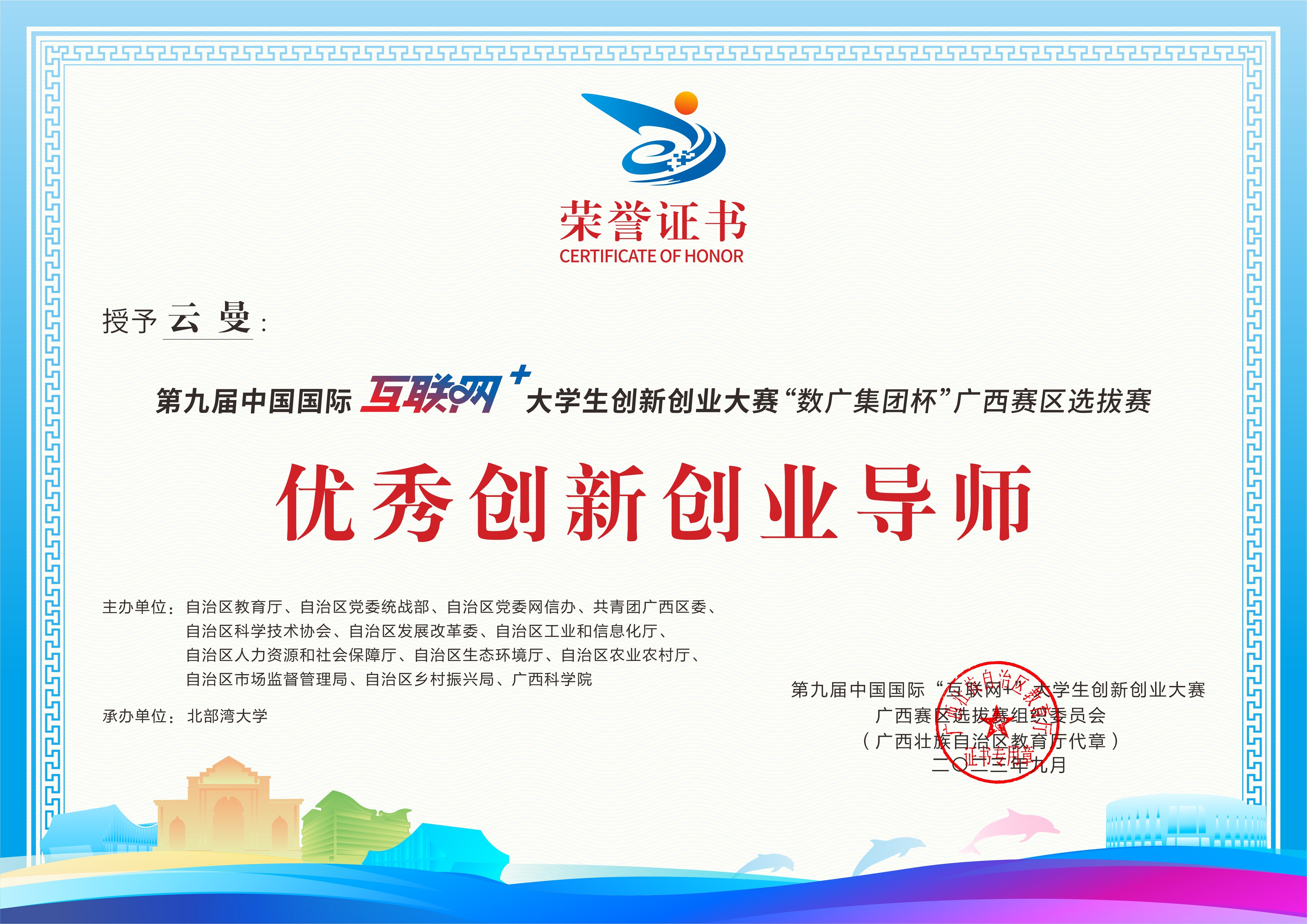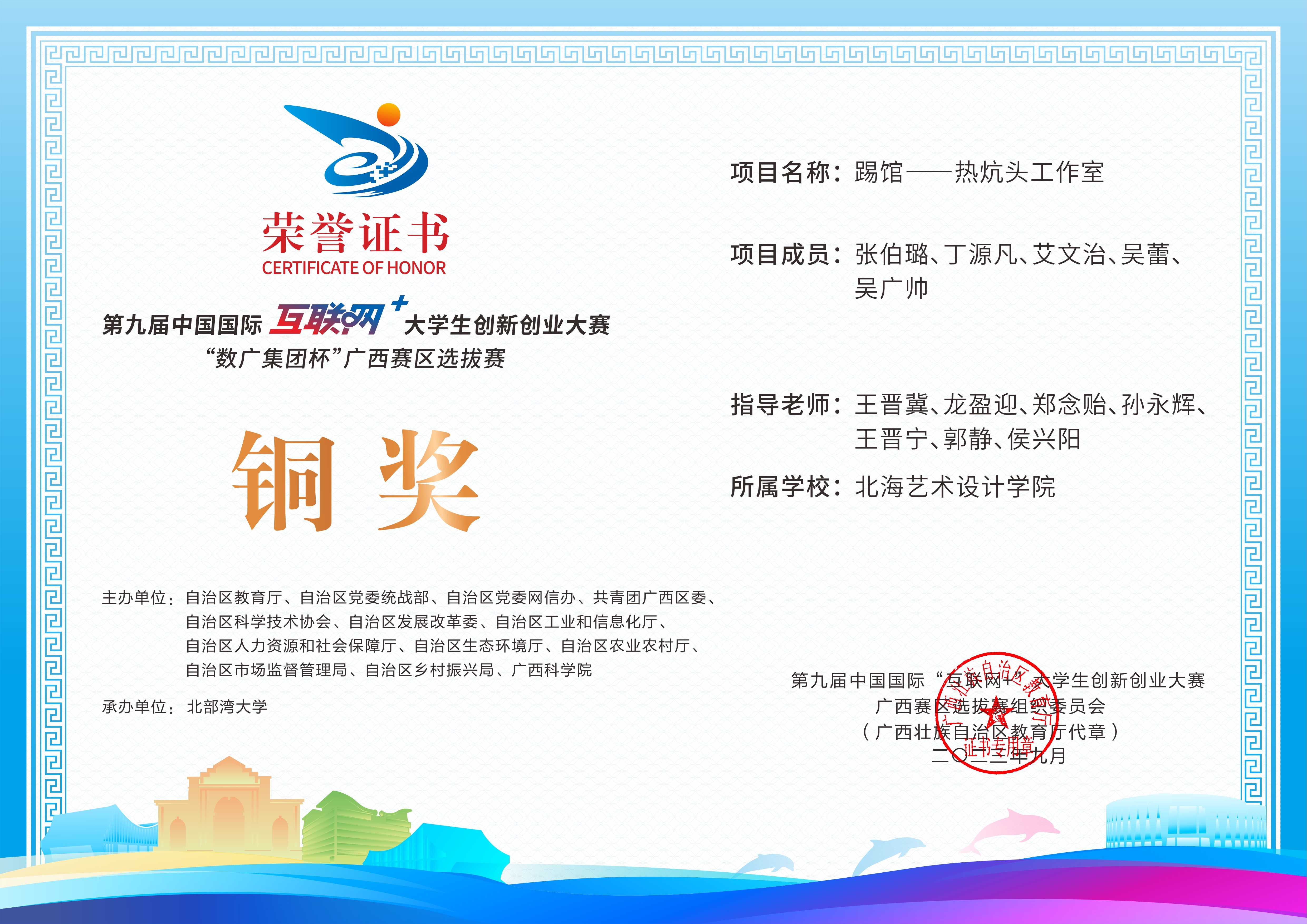 第九届中国国际互联网+大学生创新创业大赛“数广集团杯”广西赛区选拔赛获奖证书