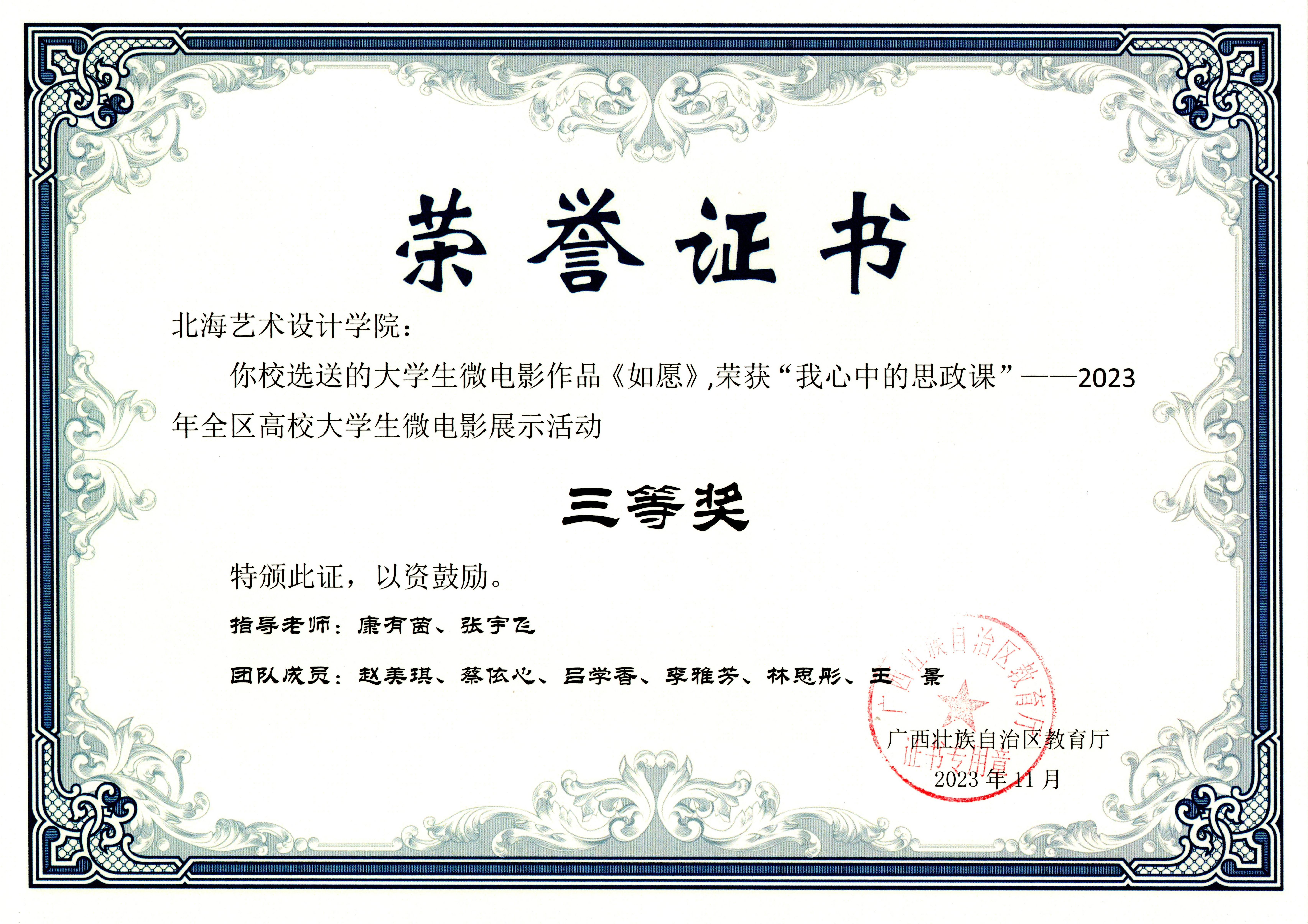 喜报:大学生微电影作品《回响》《如愿》《退伍不褪色》均荣获“我心中的思政课“——2023年全区高校大学生微电影展示活动三等奖