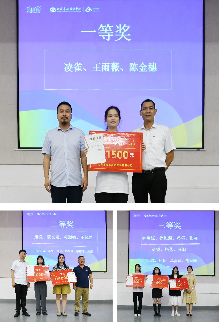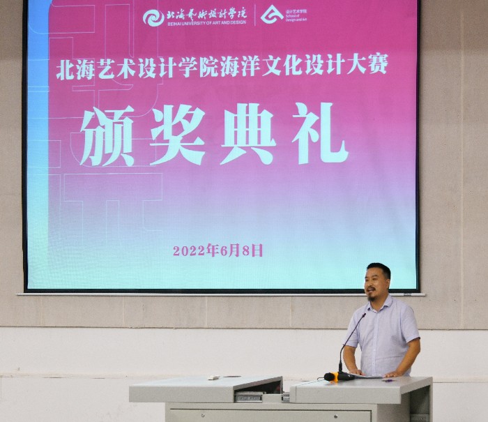 6月8日下午我院举办的“海乡缘杯”北海特产包装设计大赛、“海真珠杯”化妆品包装设计大赛、2022“海洋文化设计大赛”颁奖典礼在功德楼107顺利举行。广西海乡缘食品有限公司总经理黄祖伟、北海海真珠化妆品有限公司党支部书记兼营销总监林杰和总经理张锋忍、设计艺术学院院长李林平、副院长白建强、教研室主任张志、副主任陈莎、综合办主任吴慧霞出席本次颁奖典礼。