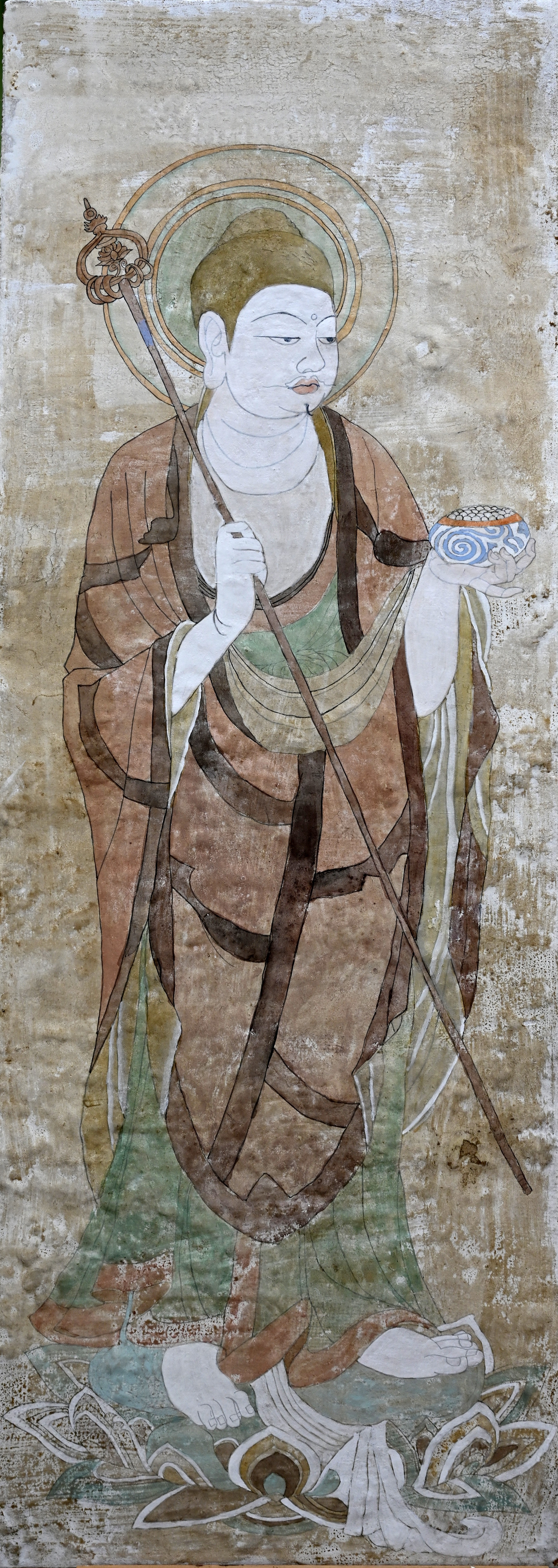 胡老师带着我们做地仗、模拟最真实的壁画体验,我们的作品也与原画同大,这都让我们更能深刻体会中国传统壁画绘画的语言表达。刚刚上手画的时候,我不太敢画,我们的画幅是最大的,但效果一直不强,导致我们小组出现明明应该是人多力量大却进度缓慢的问题。后来胡老师告诉我们254窟是北魏时期的,风格粗犷,可以大胆画一直鼓励我们引导我们大胆的表现,最后我明白完成比完美更重要。在初次上色时,我采用水彩技法里的平涂法铺色与壁画原作有着较大差距,胡老师后来告诉我们中国画要以线造型,用线找型,通过练习,我也逐渐感受到了中国画画法的独特魅力。