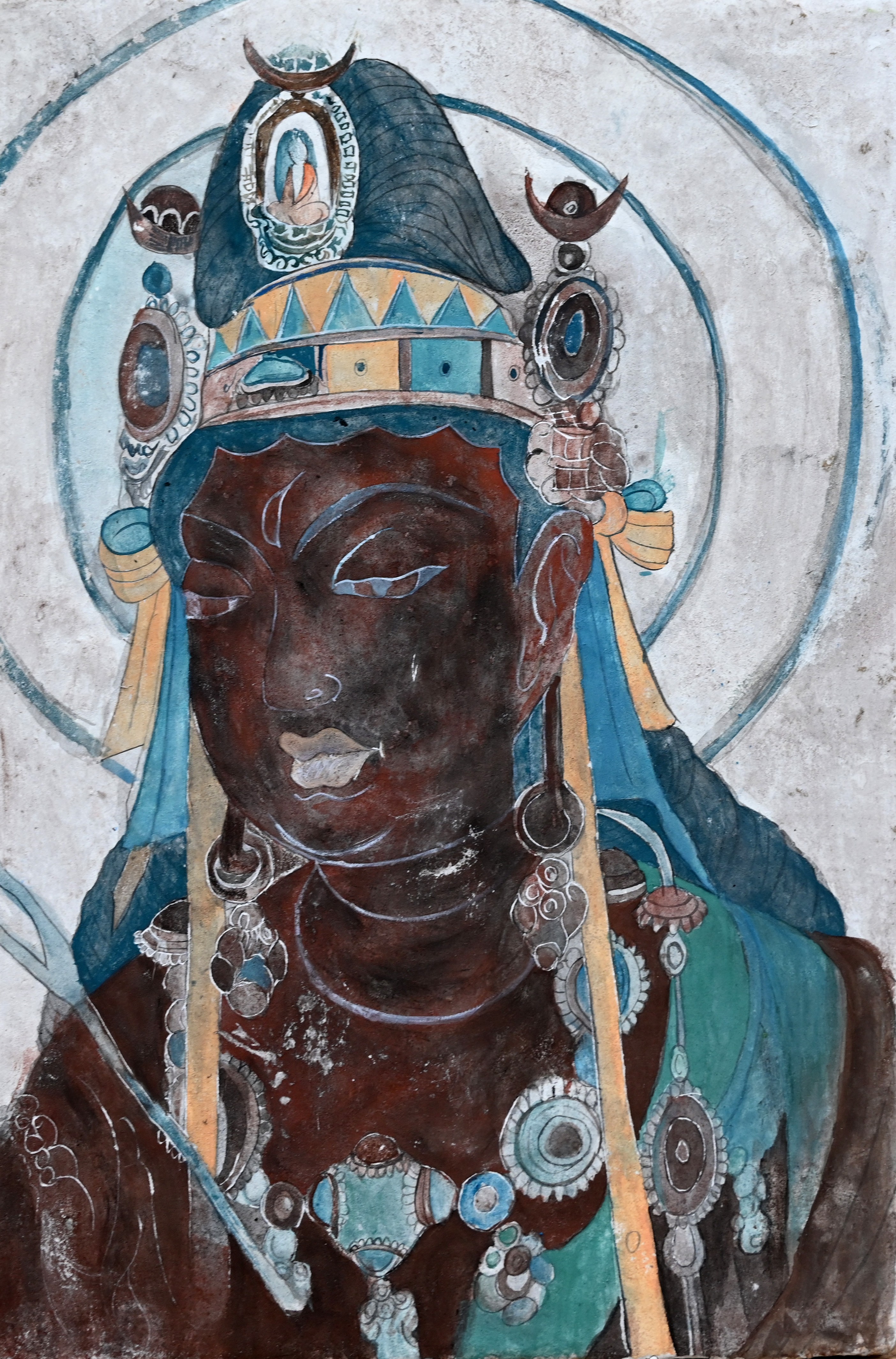 我的专业是水彩。水彩使用水溶性颜料,以水作为媒介,颜料的透明度较高;与中国画有所不同,中国传统壁画则是使用天然矿物色以及水干色颜料,相比水彩更加厚重。水彩的主要技法有:干画法、湿画法、干湿画法相结合,通过笔中水的多少来把握颜色的深浅;中国传统壁画则是先打底稿、再勾线、后画墨稿、最后上色。而敦煌莫高窟在经历了自然灾害后所呈现出的历史的破旧感,与水彩恰好有相似之处。通过这门课程的学习,我发现可以把中国传统壁画的表现方式运用到水彩之中,创新绘画方式,实现多种绘画方式的融合,给我日后的创作带来了全新的视角以及思路。