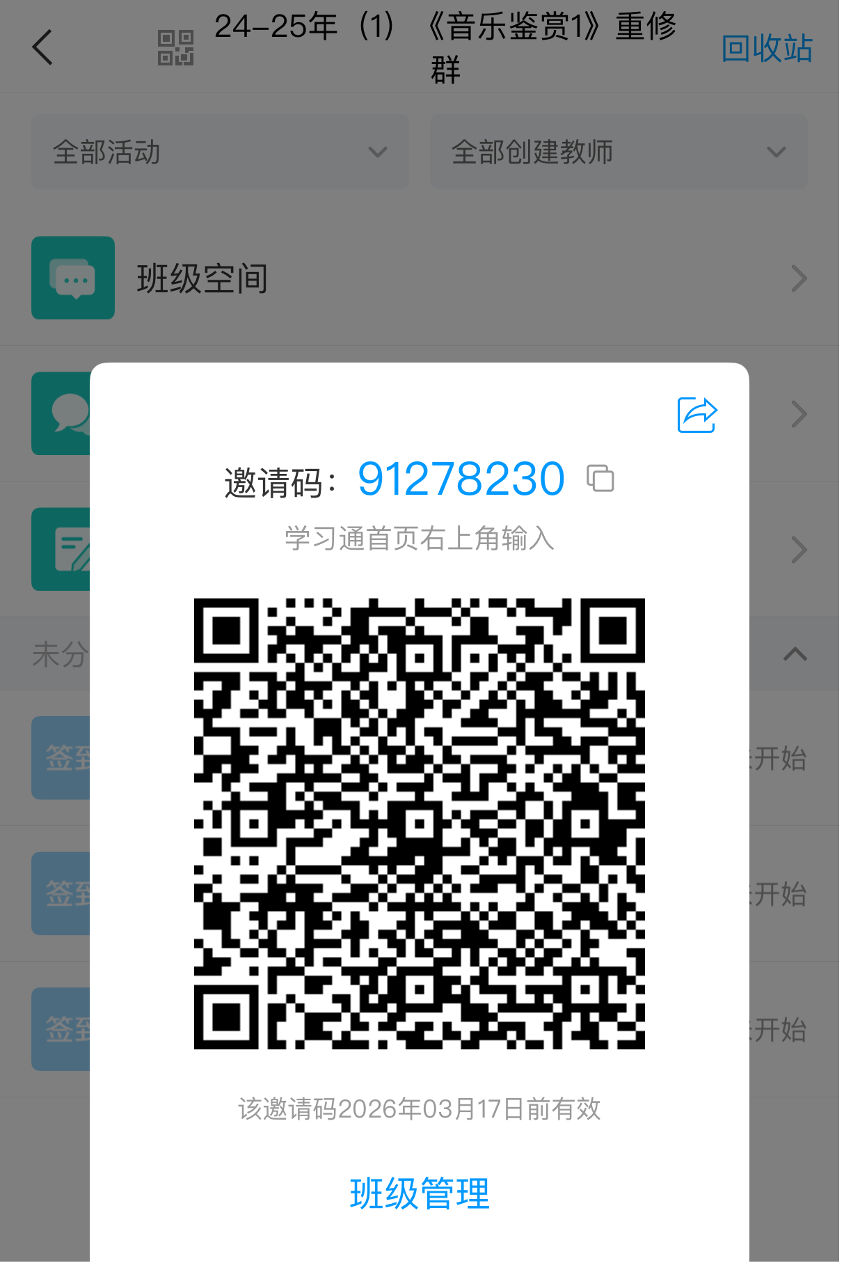 3.《音乐鉴赏》重修采取新开班重修方式。重修对象须在2025年10月17日前,前往南校区体育馆503办公室填写重修表格,并加入学习通重修班级群(“2024-2025学年一学期《音乐鉴赏1》重修群”班级邀请码91278230,在手机APP首页右上角输入或扫码加入)。