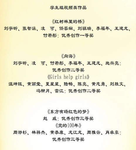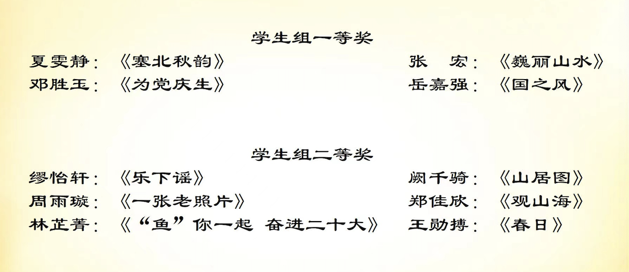 喜报,2022年12月第六届“国青杯”全国高校艺术设计作品大赛,数字媒体艺术学生,岳嘉强作品《国之风》获得学生组一等奖,缪怡轩《乐下谣》获得学生组二等奖,阙千骑作品《山居图》获得学生组二等奖,陈琦作品《中共二十大报告摘选》获得学生组三等奖,韦华作品《国韵古风》获得学生组三等奖,叶常凯作品《圆梦七巧板》获得学生组三等奖,刘宇昕,张智涵,凌可、施兴亮,任芸娴,刘骐瑞,李福年,王建龙,付若彤作品《红树林里的桥》获得优秀创作一等奖。刘宇昕、任芸娴,凌可、张智涵,付若彤、刘骐瑞,李福年、赵晨希,王建龙、宙卓,施兴亮、高薇淇作品《向海》获得优秀创作二等奖,周渺杉,林祥杰,黄恭康,龙江龙,周雅云,肖卓豪作品《党的一百年》获得优秀创作三等奖。