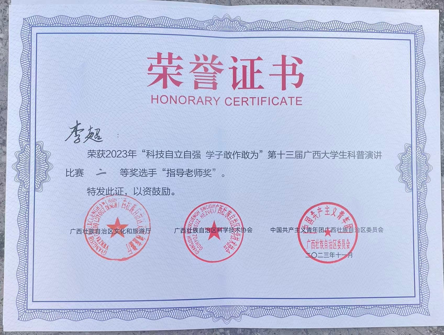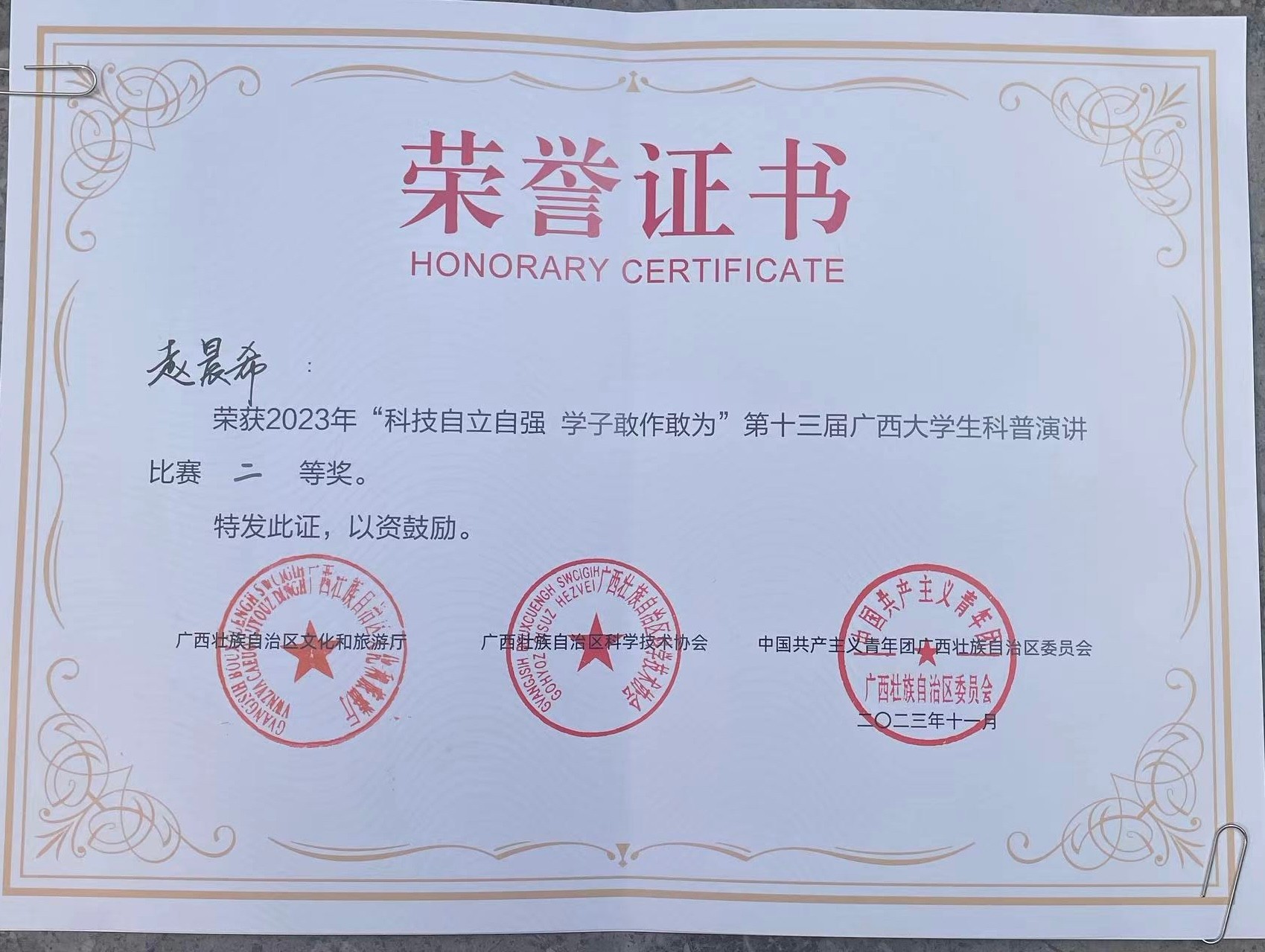 近日,由自治区文化和旅游厅、自治区科协、共青团广西区委共同主办的第十三届广西大学生科普演讲比赛决赛在南宁举行。我校动画与传媒学院播音与主持艺术专业2101班的赵晨希同学代表北海市参赛,凭借出色的表现,荣获了二等奖的佳绩。赵晨希同学的指导老师李超也因其卓越的辅导工作,荣获了“优秀指导教师”的荣誉称号。