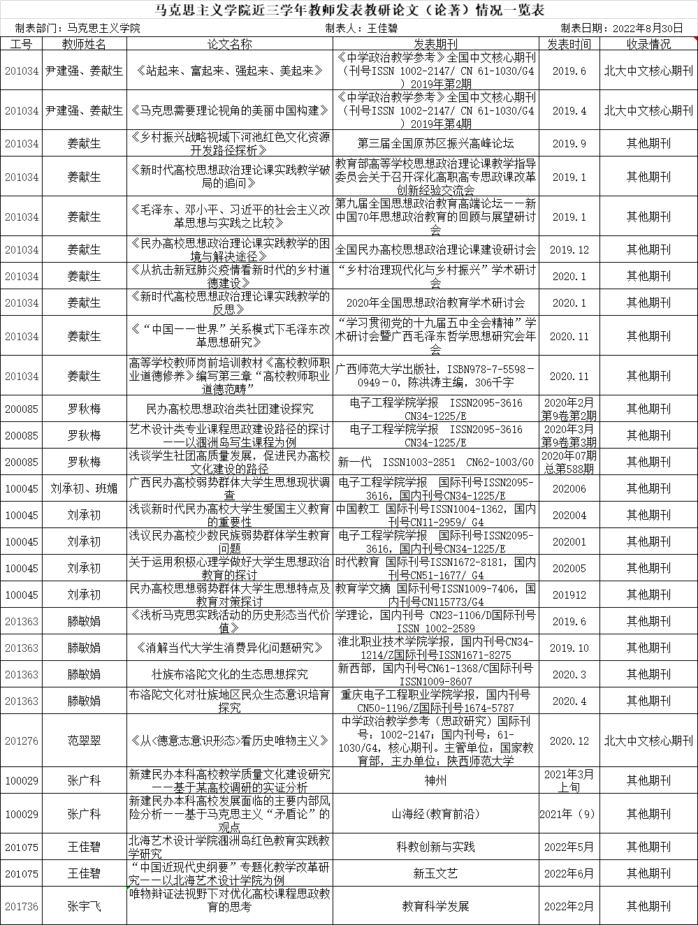 马克思主义学院近三学年教师发表教研论文(论著)情况一览表