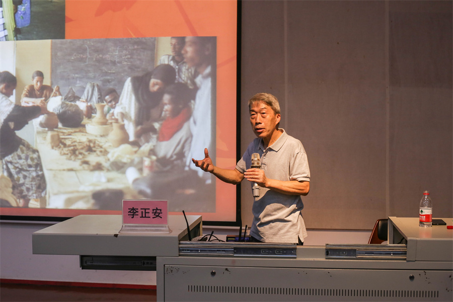 随后,李教授通过讲述自己在非洲南苏丹高校教学期间的经历与感受,向我们表示,物质与精神的双重属性,恰好是陶瓷制品最根本的属性。而悠久的制陶历史、精湛的制陶技艺,是祖先留给我们的宝贵财富,更是人类文明的珍贵遗产,也是中华文明面向世界、走向世界的坚固桥梁。李正安教授鼓励大家,面对如此丰富多彩的陶瓷艺术成果,我们定然还有追逐的空间,愿大家永远保持对未知的好奇,对现状的挑战,对梦想的追求大胆迈进前方。