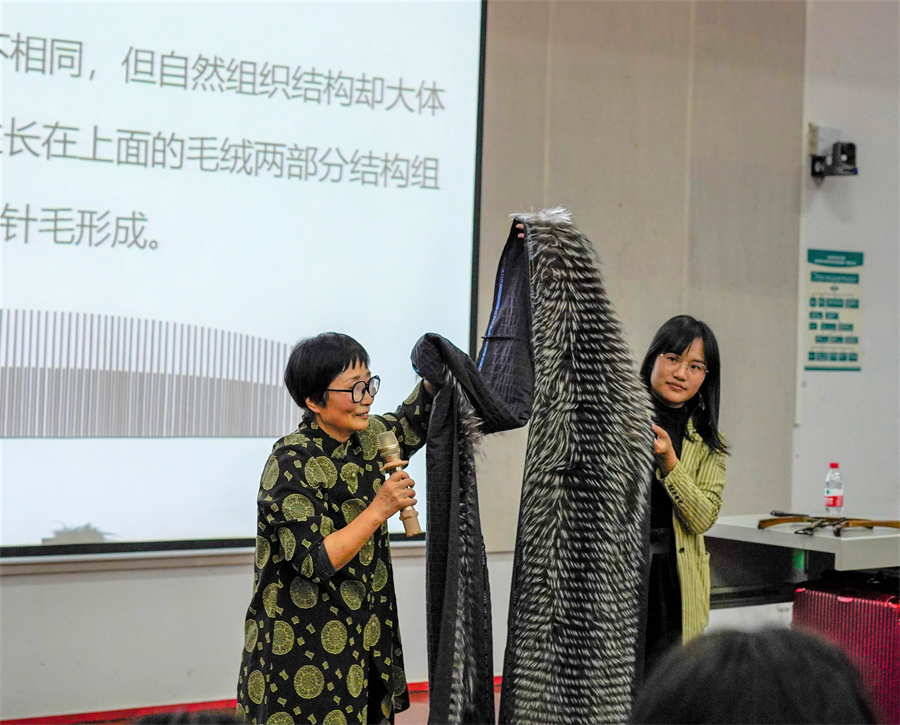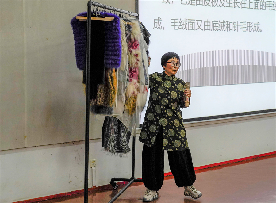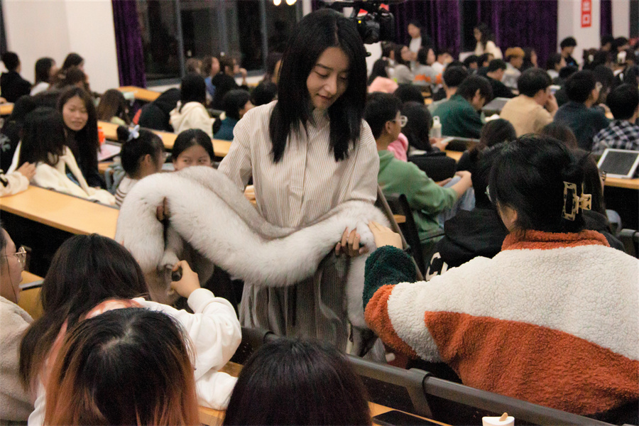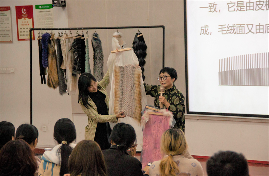 紧接着,刁梅教授用大量图片为同学们介绍了服装设计中黑白色调、粉彩色调、明艳色调、浓郁色调、自然色五个设计色彩基调,她详细解释不同色调的不同用法,为同学们带来更为丰富多样的设计知识。刁梅教授以不同的服装材料为例,向大家说明不同设计材料在设计中的作用,她重点讲解了“毛皮”这一材料,并让同学们亲手体验两种不同的毛皮质感,进一步说明它们运用在设计中会达到的不同服装成品效果。