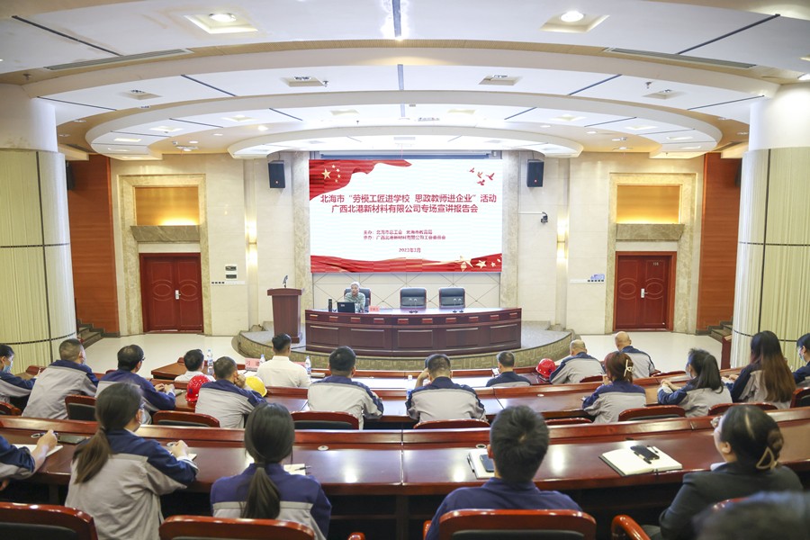 为大力弘扬劳模精神、劳动精神、工匠精神,充分发挥劳模工匠榜样示范作用和思政教师的专业优势,3月16日,由北海市总工会、北海市教育局主办的“劳模工匠进学校 思政教师进企业”宣讲报告会活动走进北港永不锈书院。我院院长姜献生教授应邀到企业进行现场宣讲,来自北港新材料各条战线的劳模工匠先进代表及一线职工代表80余人到场聆听。