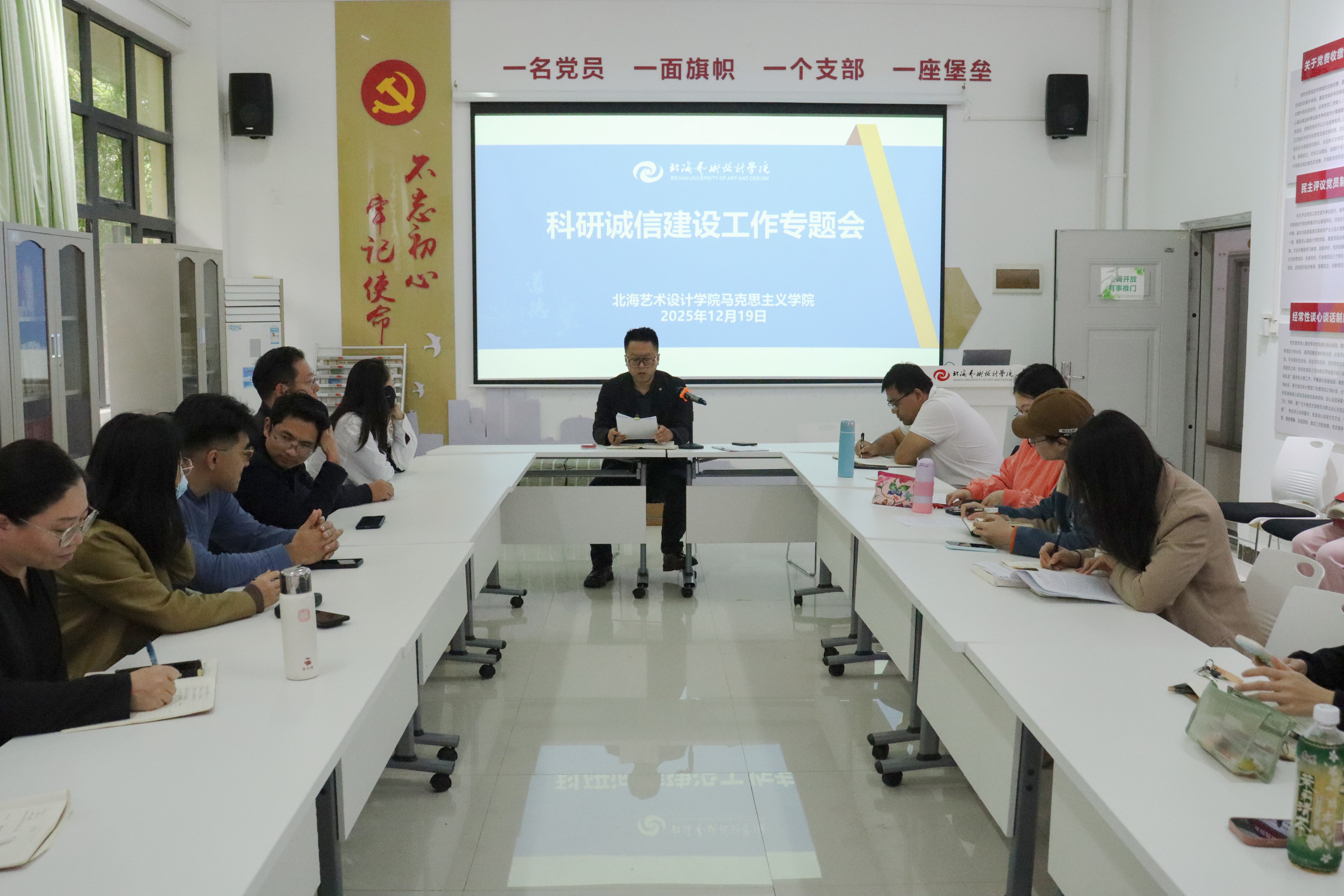 首先,我院副院长张宇飞围绕《北海艺术设计学院科研诚信管理办法》进行了系统解读,他着重强调了“科研诚信是科研质量的基石,更是学术研究的生命线”,深入剖析了“抄袭剽窃、数据造假、一稿多投、不当署名”等科研不端行为的具体表现。