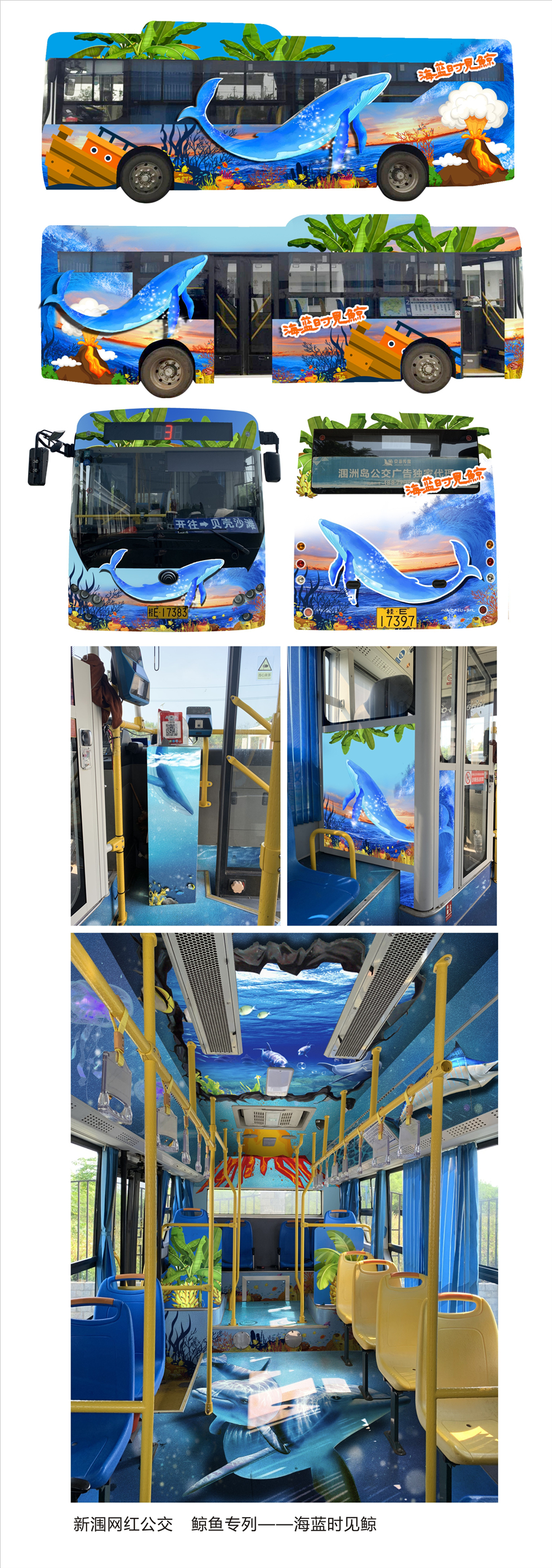 鲸鱼主题公交的车身设计以布氏鲸为核心,车身外用火山、珊瑚、海浪、帆船等海岛元素围绕,车内采用3D画面,立体感十足,给人身临其境的体验感,意趣盎然,承载着游客无数的回忆和故事,让乘客在感受美好生活的同时,践行绿色出行,也让游客实地的感受一场视觉盛宴,倡导市民游客养成文明乘车的习惯。
