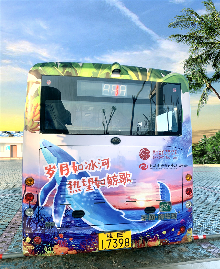 2020年11月,受北海市涠洲岛新涠公交有限公司委托,由王斌副校长领衔,带领陈晓静、伍雪红等老师组成的设计团队,为新涠公交有限公司精心设计打造了一款“鲸鱼主题”的网红公交车,元旦期间正式上线,成为涠洲岛旅游打卡的新亮点。