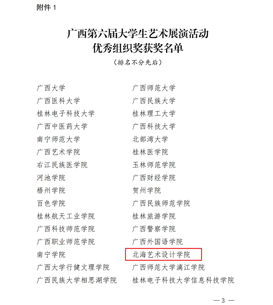 近日,由广西壮族自治区教育厅主办的广西第六届大学生艺术展演活动圆满落下帷幕。在本次展演中,我校选送的作品共获得16个奖项,其中艺术表演类朗诵作品获二等奖1项、三等奖1项;艺术作品获一等奖1项、二等奖3项、三等奖7项;美育创新改革案例获三等奖2项,学校获优秀组织奖。本次参赛成绩是我校参加自治区大学生艺术展演以来的最好成绩。
