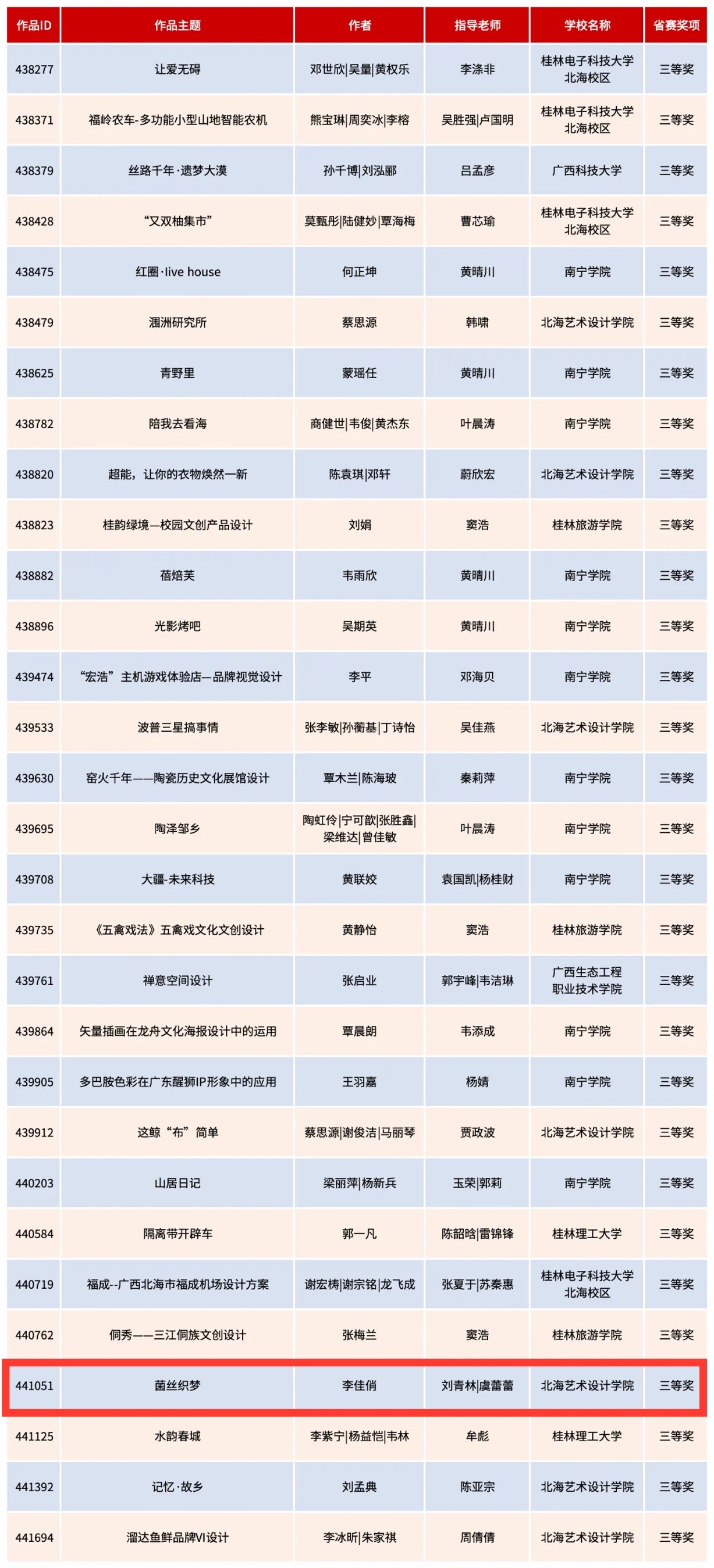 获奖名单按照作品ID大小排列