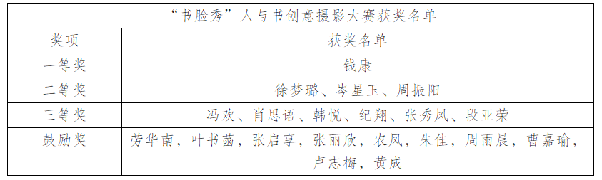 根据《2022年阅读推广活动――“书脸秀”人与书创意摄影大赛》评选要求,图书馆邀请我校专家教授对参赛作品进行评选,现将获奖、名单公示如下: