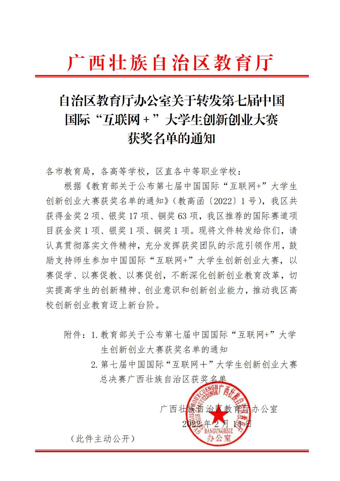 自治区教育厅办公室关于转发第七届中国国际“互联网+”大学生创新创业大赛获奖名单的通知.pdf