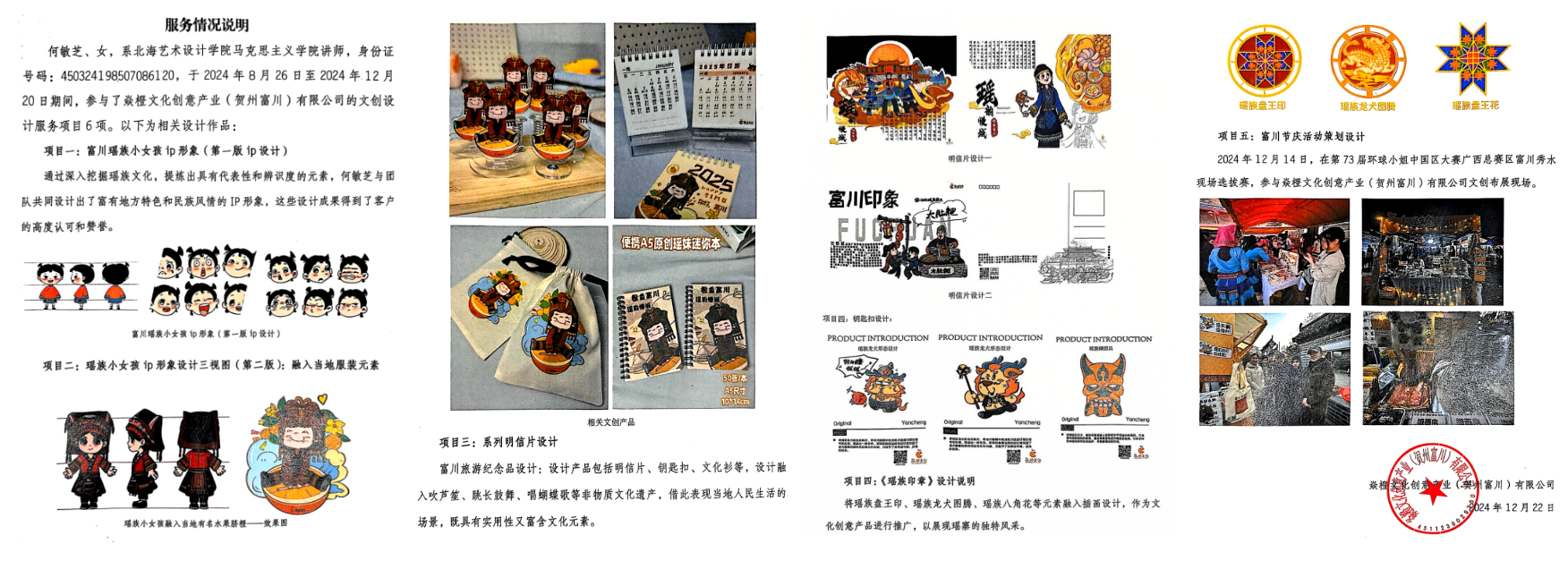 北海艺术设计学院马克思主义学院联合富川瑶族自治县焱橙文创,于 2024 年 8 月启动为期三年的 "思政 + 双创 + 文创" 合作项目。学院姜献生院长、民族学专家马福元教授、何敏芝讲师等组成考察团队,深入调研富川文化遗产与特色产业,构建 "实践基地共建 - 思创课程开发 - 校企活动联动" 的服务架构。通过校企资源整合,将企业设为思政实践教育基地,开发融入瑶族文化的双创课程,开展文创设计大赛等活动,形成 "理论教学 - 实践转化 - 产业应用" 的闭环服务模式。