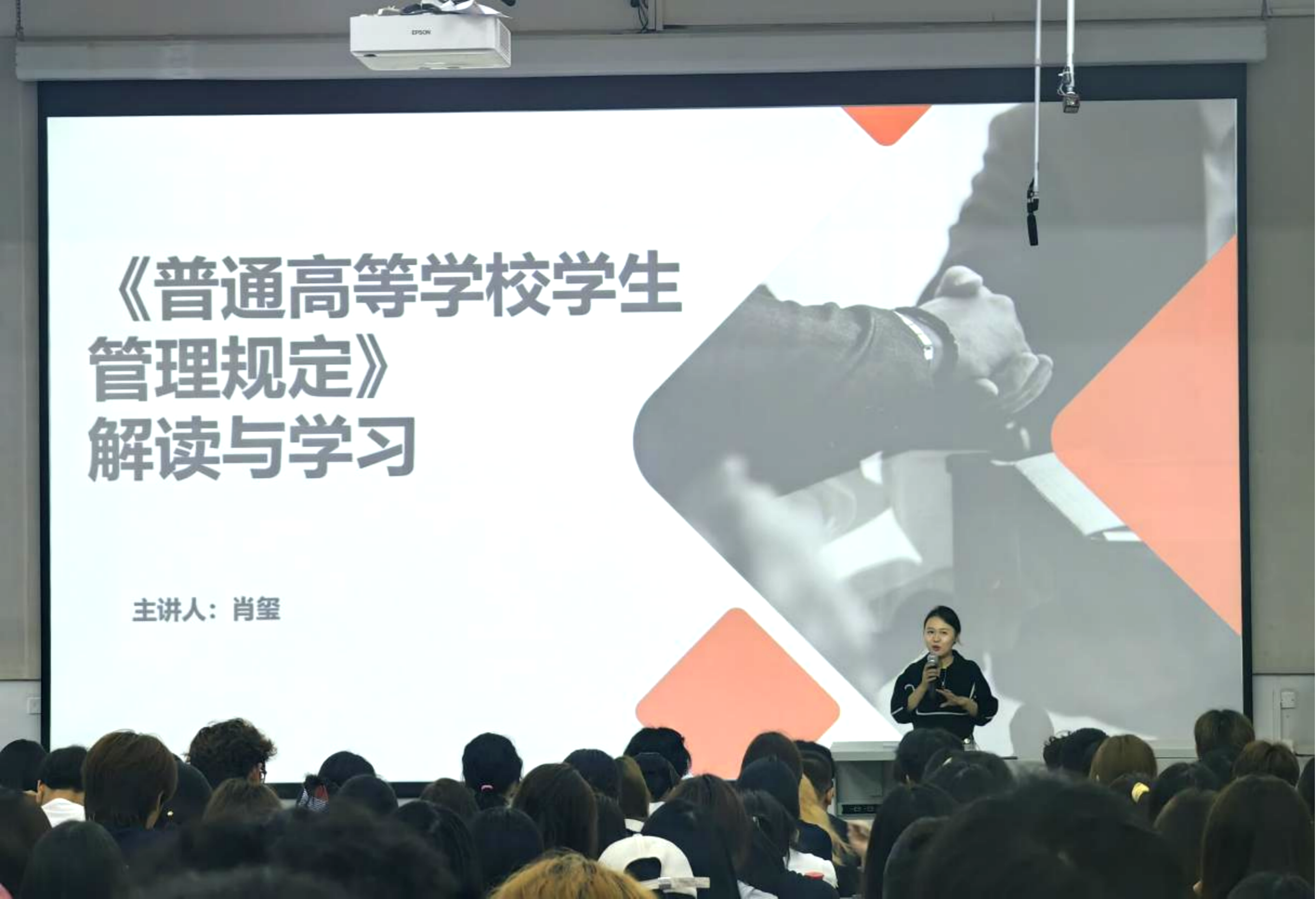 肖玺院长从学生的权利与义务、学籍管理、校园秩序与课外活动、奖励与处分、学生申诉等方面为新生们进行解读。教育部41号令强调依法治校、立德树人,明确学生享有公平教育等权利,也须守法勤学;学籍管理突出弹性学制、休学创业;校园秩序鼓励课外活动,禁违法;奖励突出立德树人,处分坚持教育与惩戒并重;健全校内申诉与行政复核机制,保障学生合法权益,促进学生全面发展。(蒋理 摄)