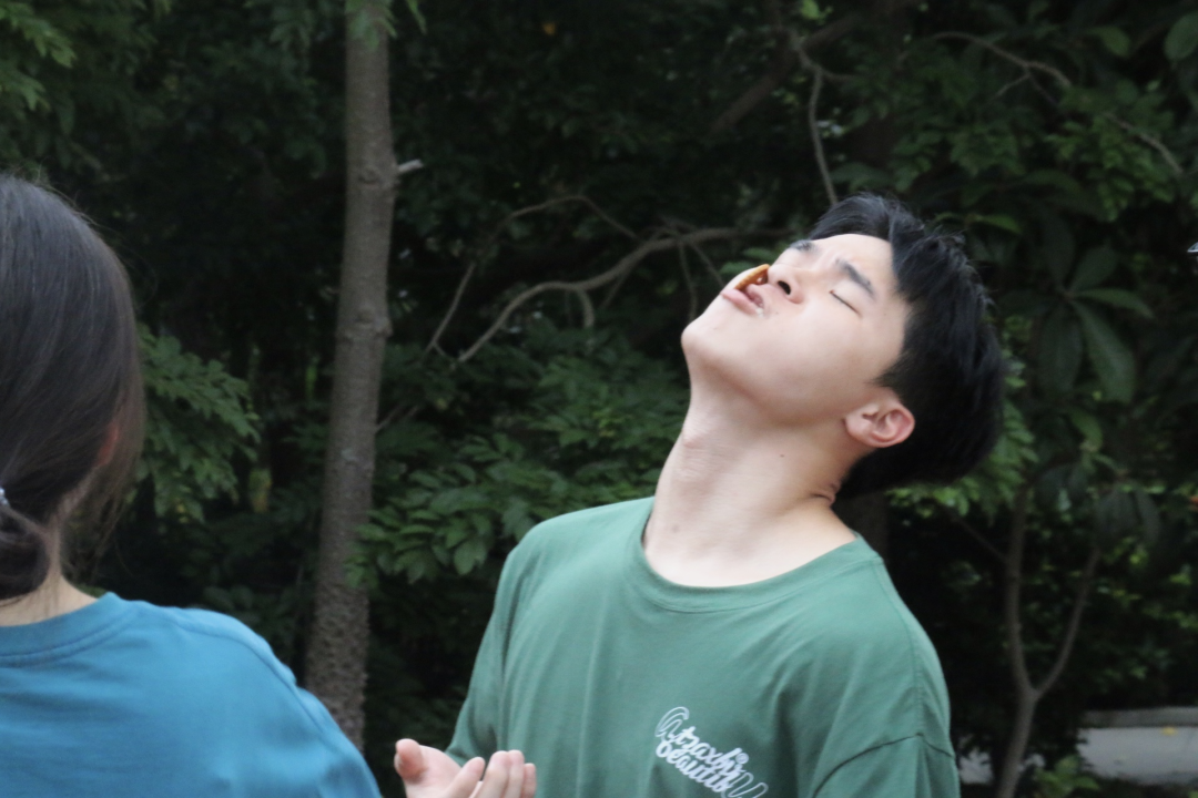 每位参赛选手的额头上放置一块饼干,参赛选手可运用自己的面部肌肉或调整仰头角度,将饼干送到口中。选手们为吃到饼干使劲浑身解数。