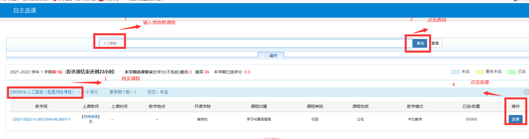 (二)选课前请每位学生务必仔细阅读《2022-2023第一学期公共选修课课表》,注意所选课的上课时间不能与本人的其它课程时间冲突,也不要选择重复的课程。