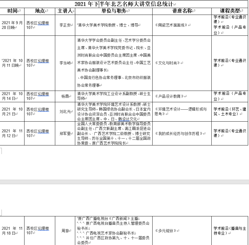 2021年下半年北艺名师大讲堂信息统计