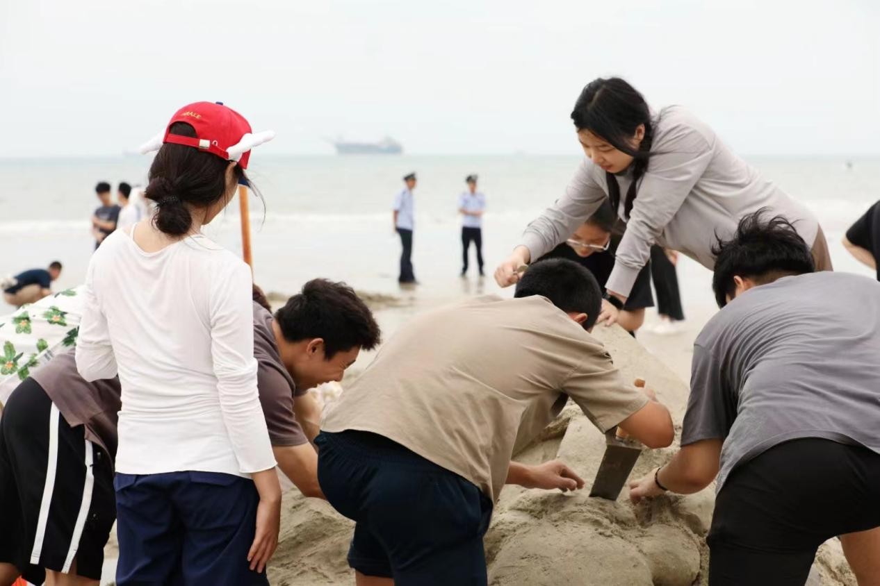 建筑与环境艺术学院学子在沙滩上尽展饱满热情与青春风采。在沙雕、沙滩排球、袋鼠跳、同舟共济、巨人脚步、水到渠成比赛项目中挥洒青春汗水,建环学院喜获第二十一届沙滩运动会团体总分第二名。(建环学院学工办/摄)
