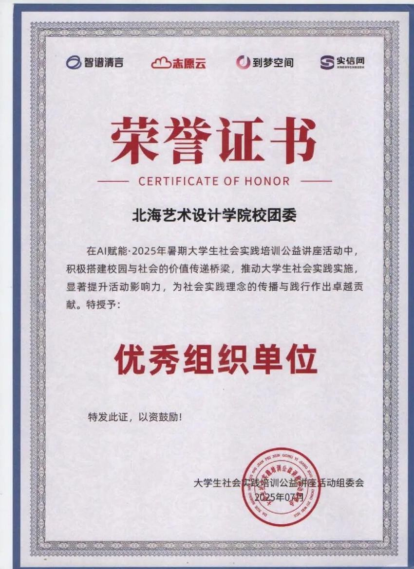 近日,我校团委在“AI赋能·2025年暑期大学生社会实践培训公益讲座活动”中表现卓越,被授予“优秀组织单位”荣誉称号。