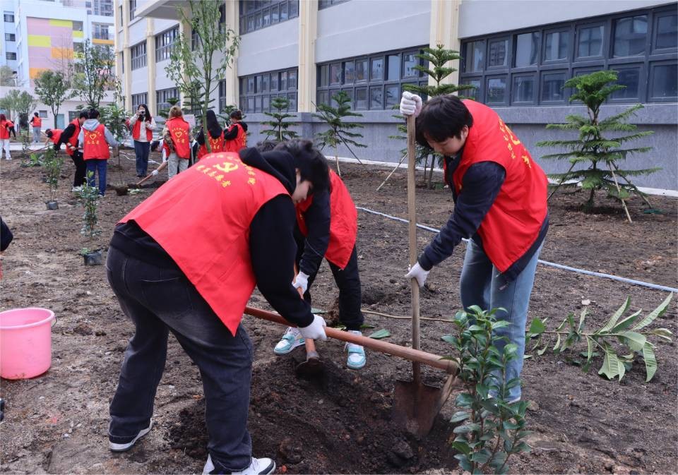 为深入贯彻习近平总书记重要讲话精神,牢固树立绿水青山就是金山银山的理念,增强全校师生的环境保护意识,同时美化校园环境,3月12日下午,我校团委在南区开展“志愿我先行,共栽青年林”植树活动,活动共有50余名师生志愿者代表参加,用行动播种绿色,美化环境。
