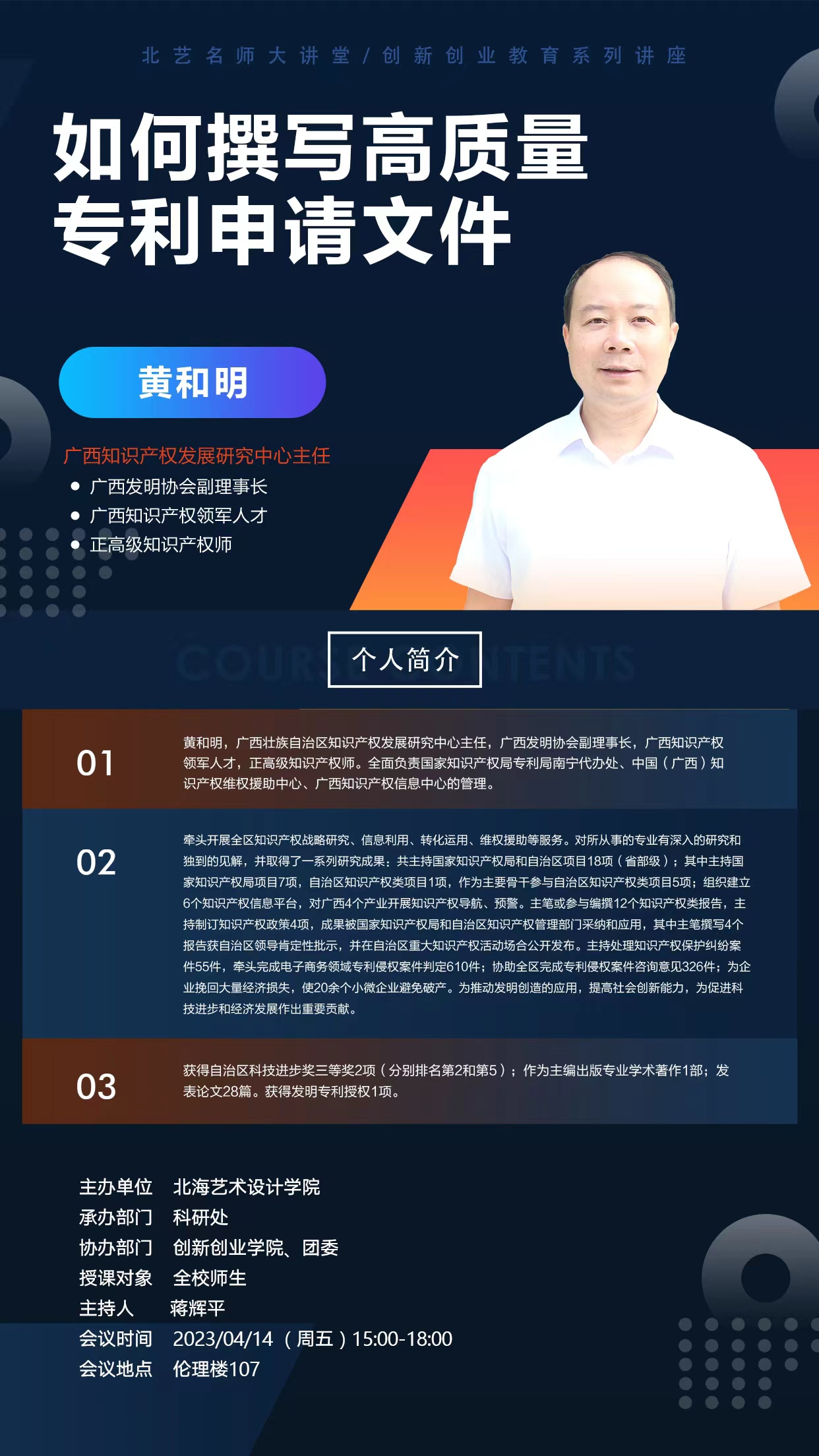 临近讲座结束,黄和明主任预留了交流时间,听取了参会学生们在专利申报上遇到的众多具体困惑,并给予了解决方案。为了深化本次讲座、学习的作用和意义,黄和明主任给大家留下了电话号码和微信,鼓励大家多咨询;同时,对北海艺术设计学院关注知识产权知识的学习、积极申报专利、推崇科研的态度给予了高度的肯定!