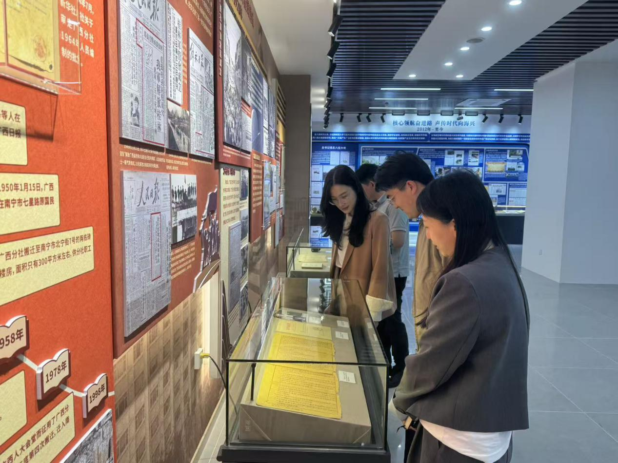 会后,学院一行在相关负责人陪伴下共同参观了新华社广西分社发展历程展厅。通过详的图文资料、珍贵的历史文献等内容,深入了解了新华社广西分社自创立以来的光辉历程、重大报道成果以及在新闻传播领域作出的突出贡献。