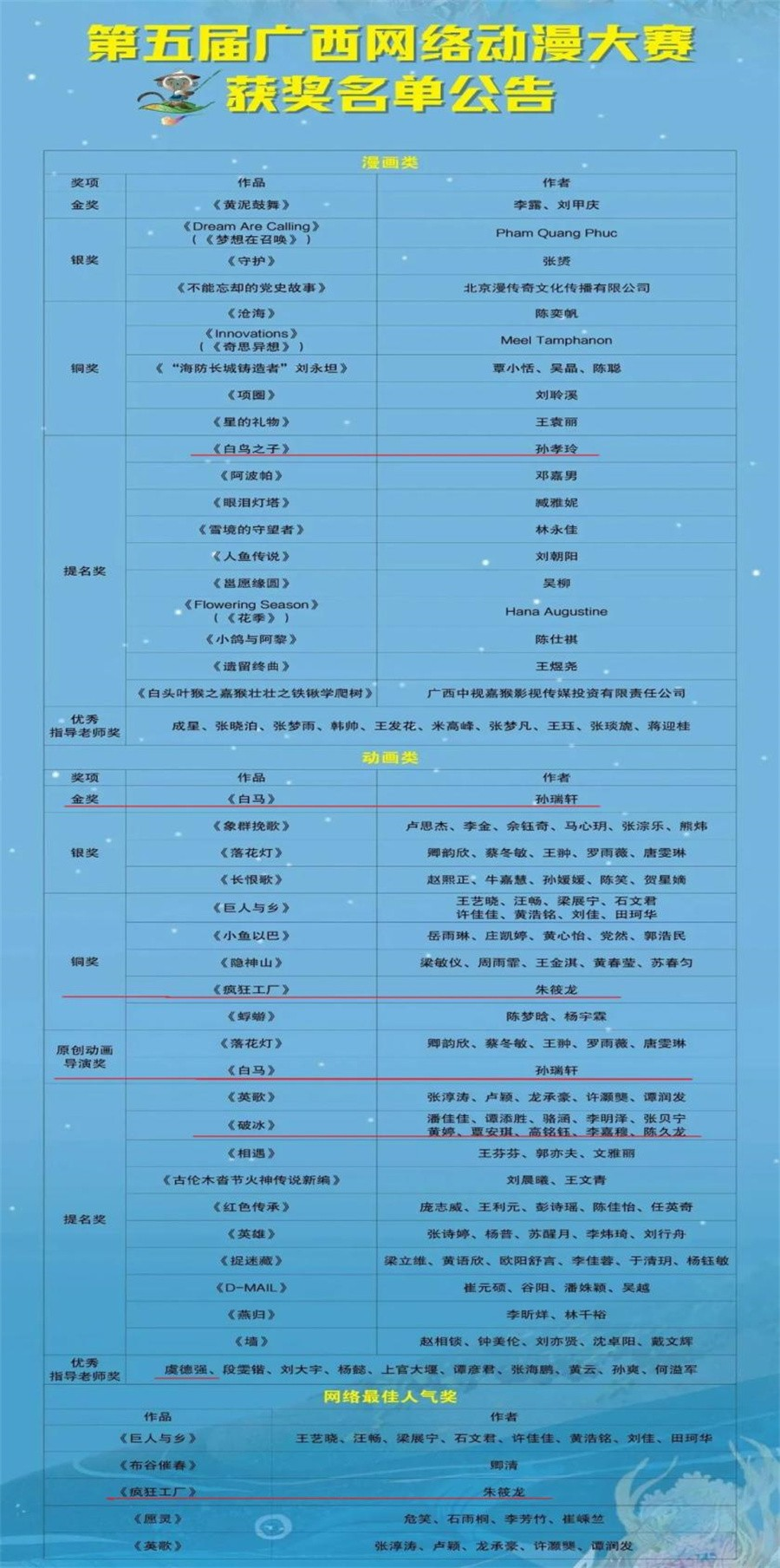 近日,由广西壮族自治区新闻出版局、广西壮族自治区网信办、广西出版传媒集团共同主办,广西科学技术出版社等单位承办的广西动漫最高规格的第五届广西网络动漫大赛获奖名单公布。我校动画与传媒学院动画作品《白马》荣获动画类金奖和最佳导演奖、《疯狂工厂》荣获动画类铜奖和最佳网络人气奖、《破冰》荣获动画类提名奖、《白鸟之子》漫画类获提名奖,共获奖6项,是动画与传媒学院继第四届广西网络动漫大赛荣获动画类金奖和最佳导演奖后再次获奖。