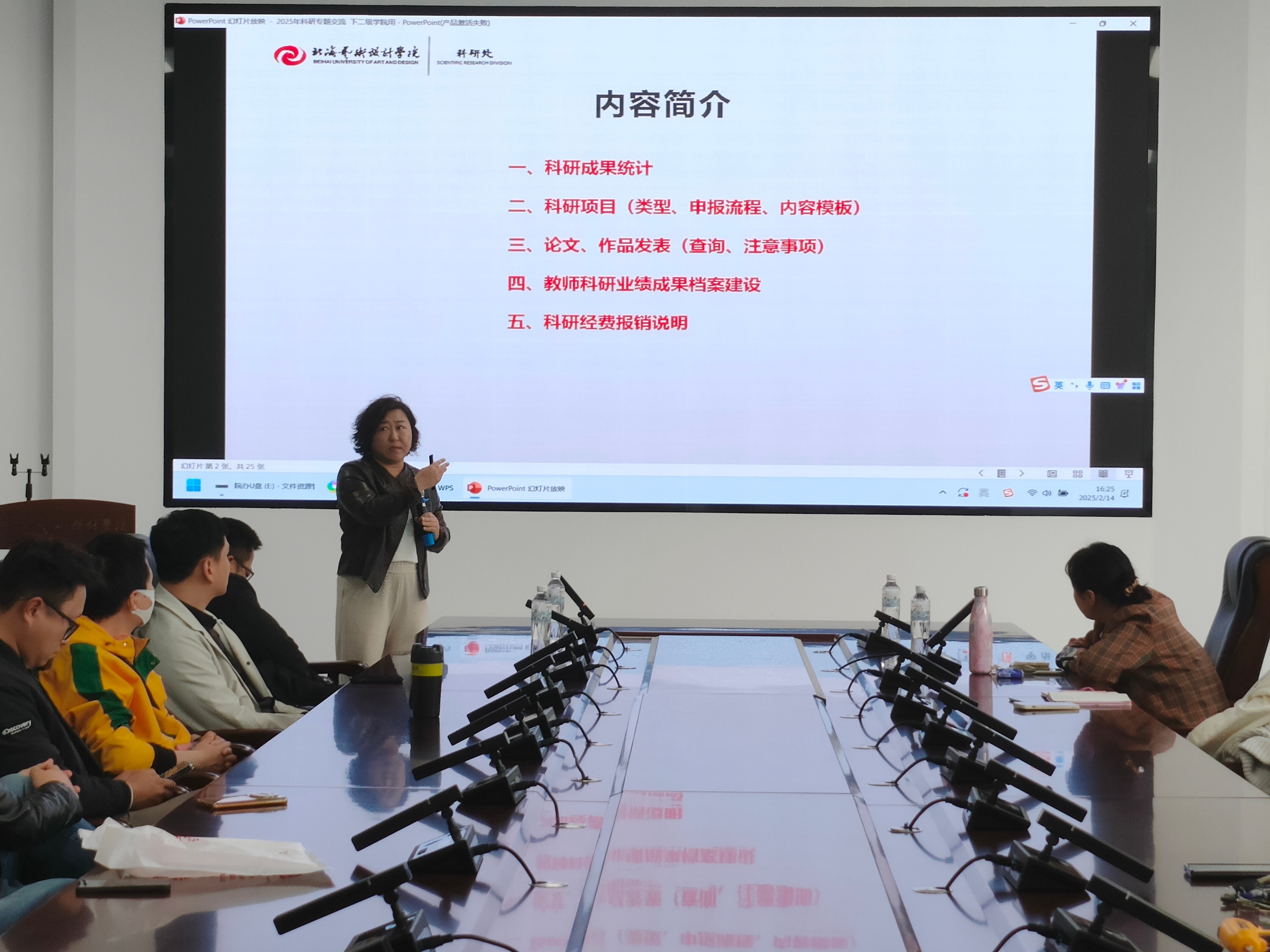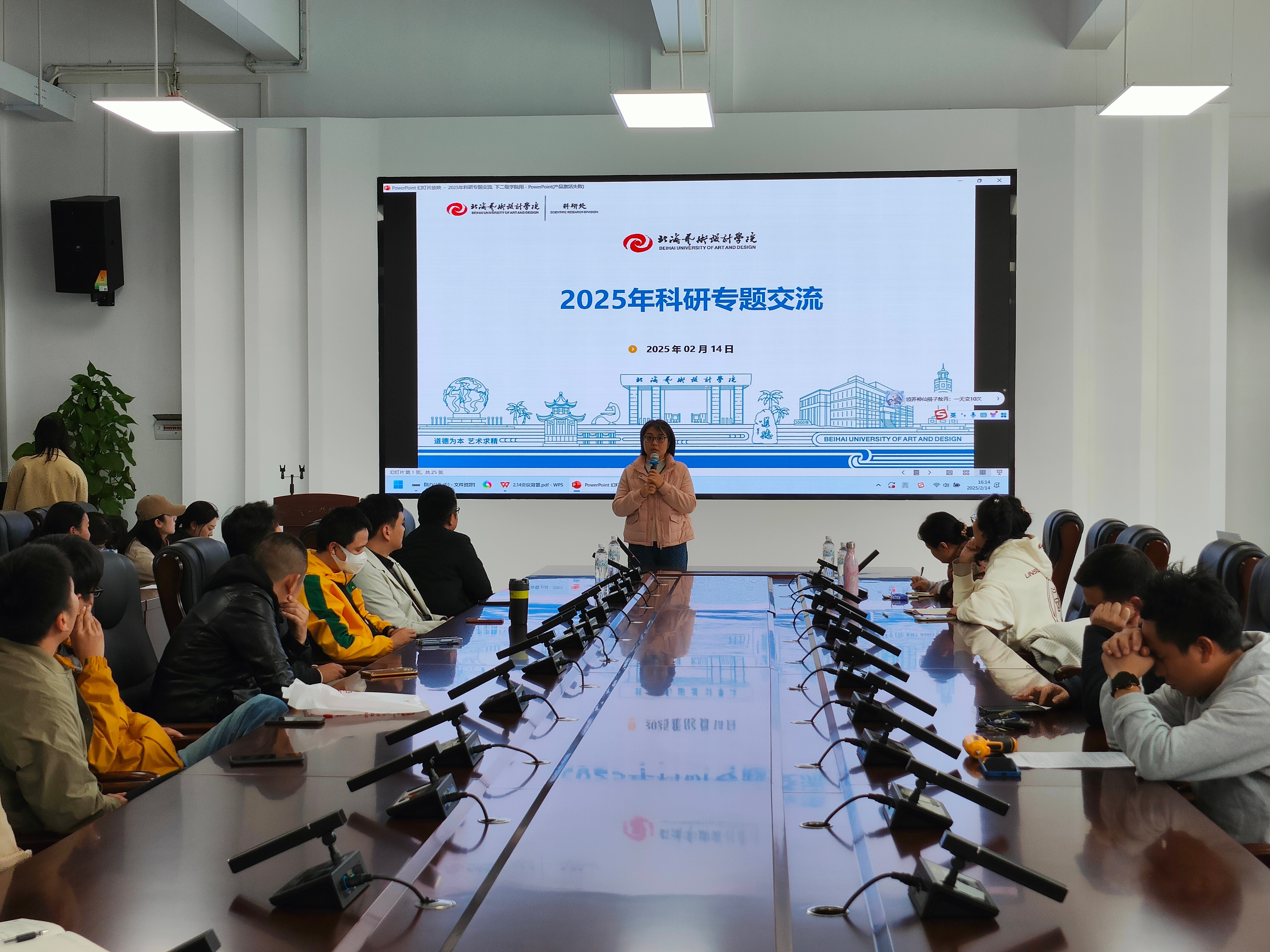 校科研处处长、副处长列席会议,在会议中为美术学院教师详细介绍了2025年校科研工作的重点、相关课题的申请流程和具体要求。首先介绍了校科研处分工情况,明确了处长、副处长及办事老师的具体职责。强调要分辨教师个人成果和学院成果,并介绍了广西艺术基金的申报流程和要求。特别提醒各位老师提前准备网上填报工作,并注意系统可能的不稳定性。还介绍了国家艺术基金的申请情况,并建议老师们平衡申请广西艺术基金和国家艺术基金。此外,还强调了教师个人业绩成果档案的重要性。