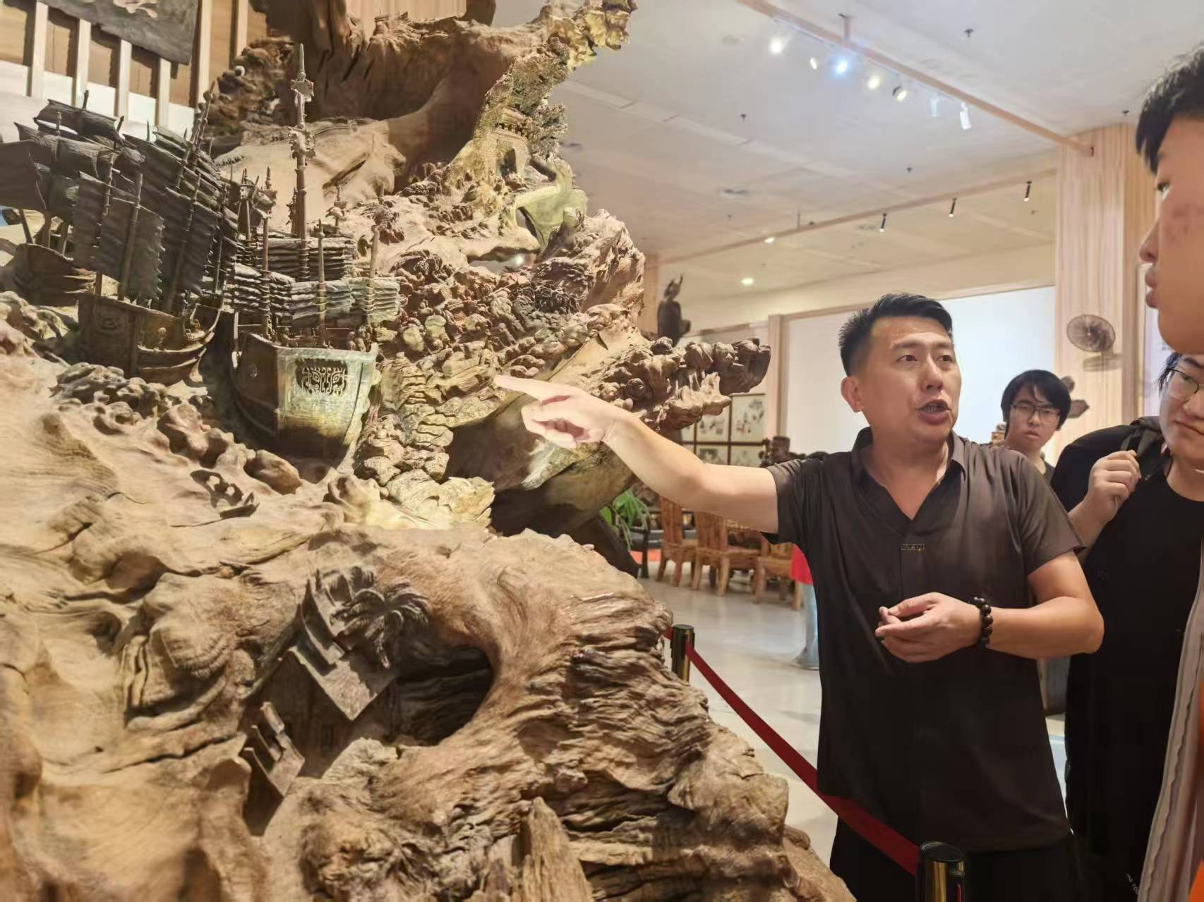 随后,广西工艺美术大师杨峻带领学生们领略木雕艺术的魅力。杨峻老师设 计创作的根雕艺术作品深受好评,其代表作《珠还合浦》《合掌观音》等曾获 桂天工奖 金奖。他向学生们展示了木雕从选材到成品的全过程,介绍不同木材 的特性以及适合创作的题材。同学们看到了各种风格的木雕作品,有的气势恢宏, 有的细腻入微,感受到木雕艺术独特的表现力。