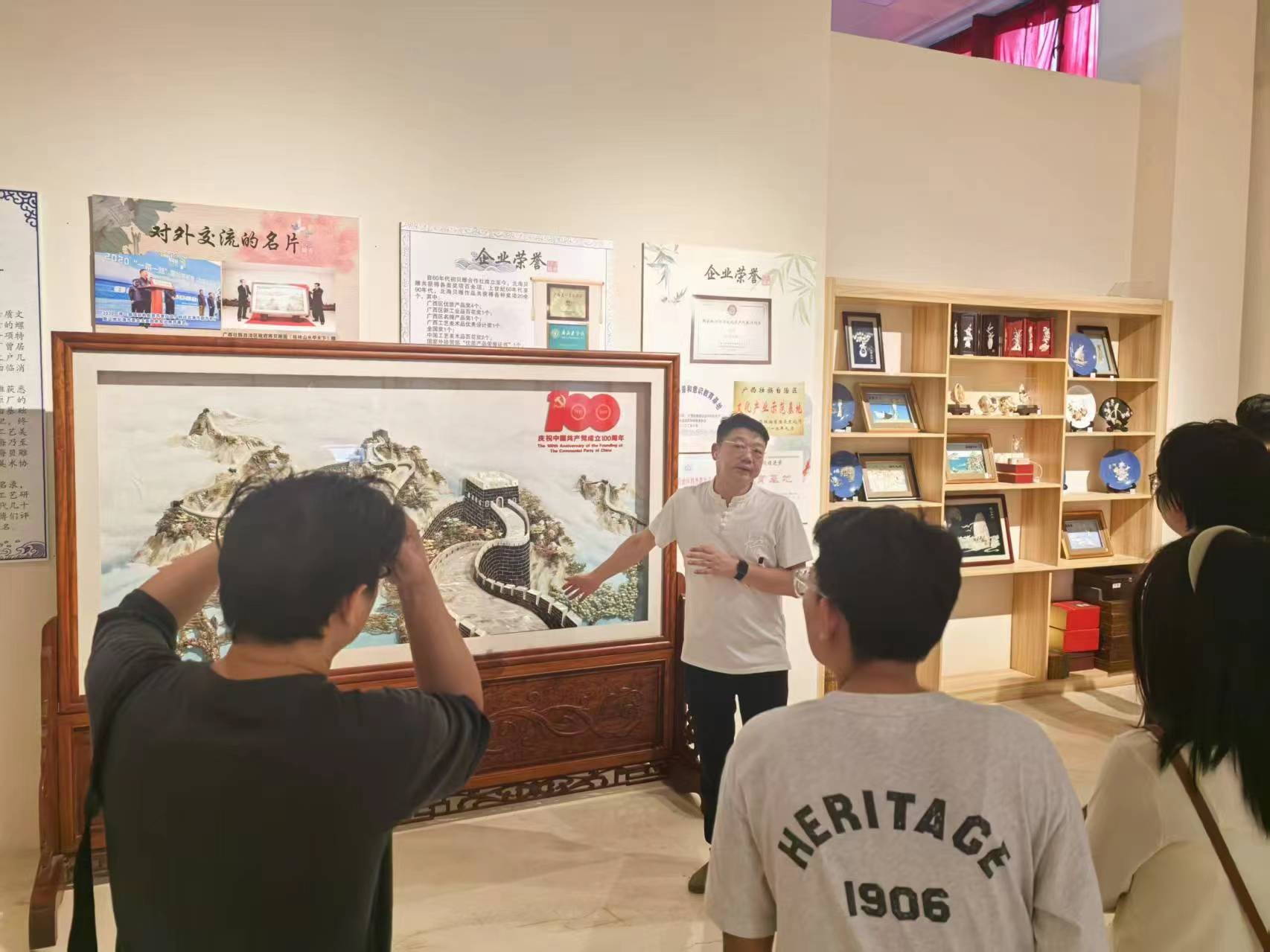 当日上午,同学们满怀期待地抵达海丝非物质文化遗产体验馆。该馆作为广 西首个大型综合性非物质文化遗产体验馆,荟萃了北部湾地区各级非遗技艺传承 人和工艺美术大师,涵盖贝雕、角雕、银雕、木雕、陶瓷等众多国家级、省市级 非遗项目和特色工艺美术类别 ,是传承和展示海丝文化的重要窗口。