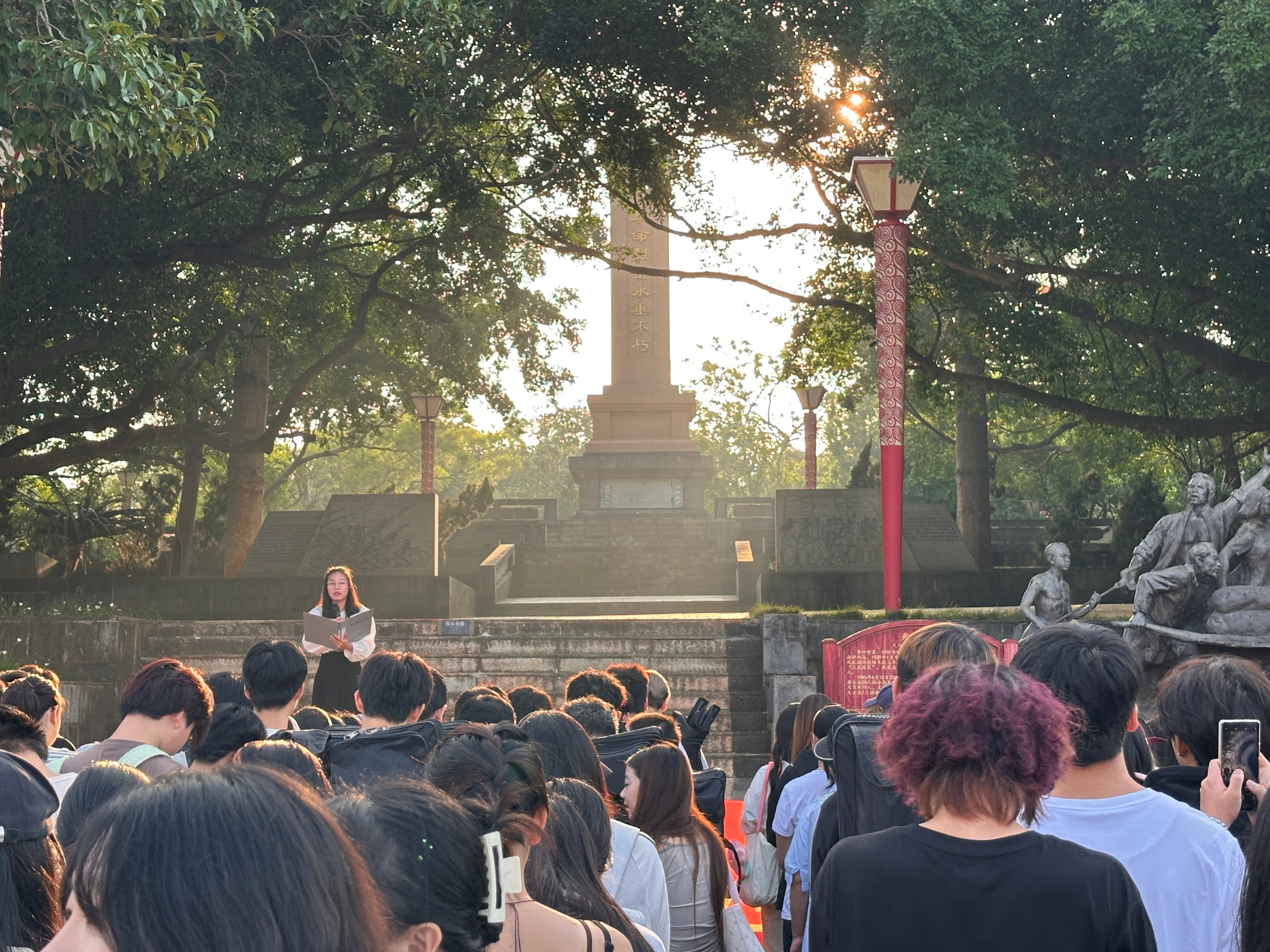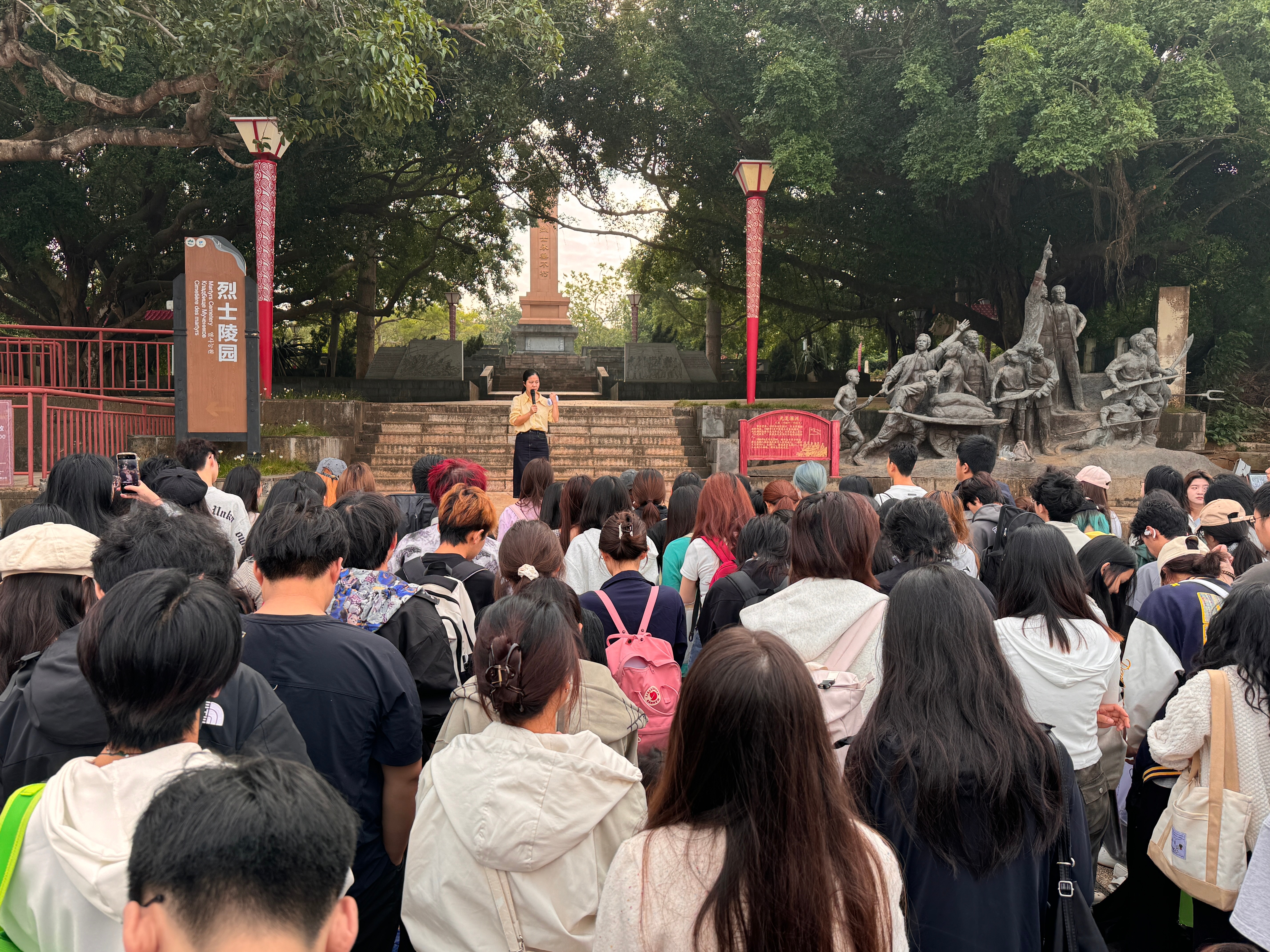 与此同时学院组织同学们前往涠洲岛红色旅游景区,这片位于岛湾背山坡的革命历史纪念地,见证了岛屿的烽火岁月。在庄严肃穆的红色广场上,学生们参与了一场“红色革命历史现场教学”。马克思主义学院专任教师李妙燕文姣丽通过讲授学生们探索“革命历史”的深厚内涵,实现了一次深刻的“思政教育”与艺术实践的融合。