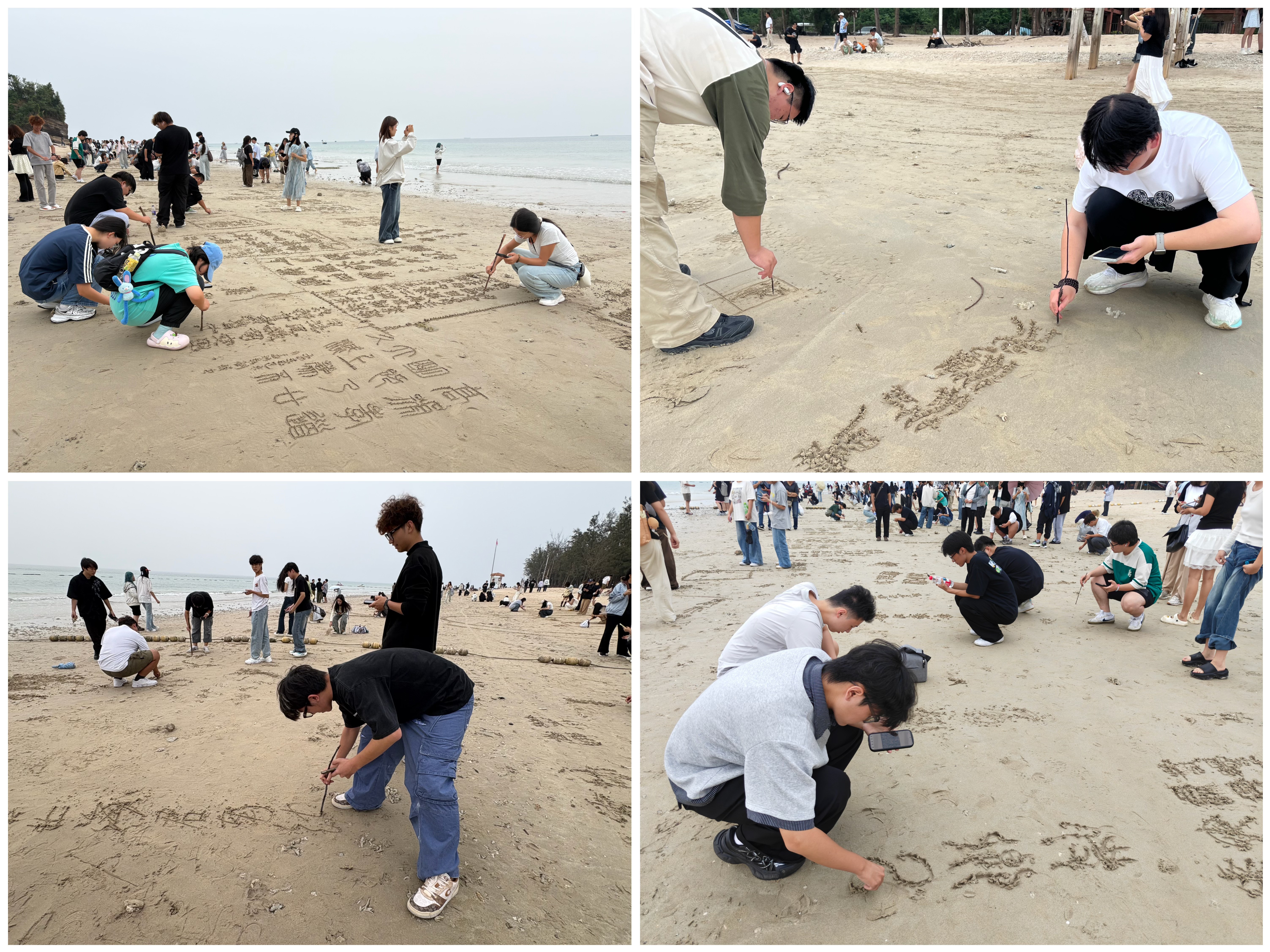 11月17日,书法学院首届“沙韵书香・笔耕蓝海”沙滩书法大赛在贝壳沙滩启幕。学院常务副院长苏乃从详细介绍了赛事规则与安全须知,强调在自然环境中创作既要展现艺术创造力,也要牢固树立安全意识与环保理念。随后,师生共同转入实践环节,依托海滩这一独特的自然场景,展开现场书写。在教师引导下,学生们通过“以手代笔、以沙为纸”的方式,亲身体验“锥画沙”笔法的独特韵味,在潮汐边界感受笔锋与沙粒的摩擦,有效提升了艺术感知力与创作适应性。