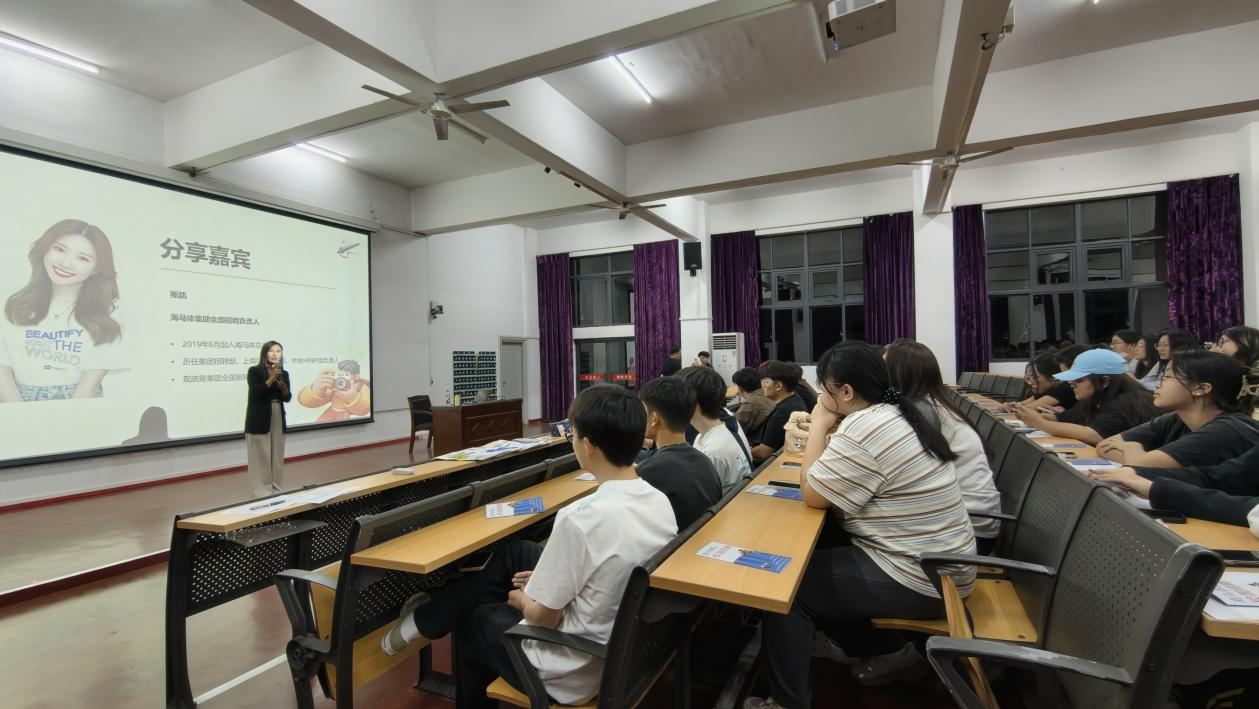 当晚19时30分,海马体集团校招宣讲会顺利开展。集团全国招聘负责人宋婷为美院师生全面介绍了海马体集团的企业文化、发展历程等核心内容,南部校企招聘负责人程颉鑫则对校招报名规则、实习流程、岗位要求等关键信息进行细致解读,让师生对企业招聘需求与发展平台有了清晰、全面的认知。