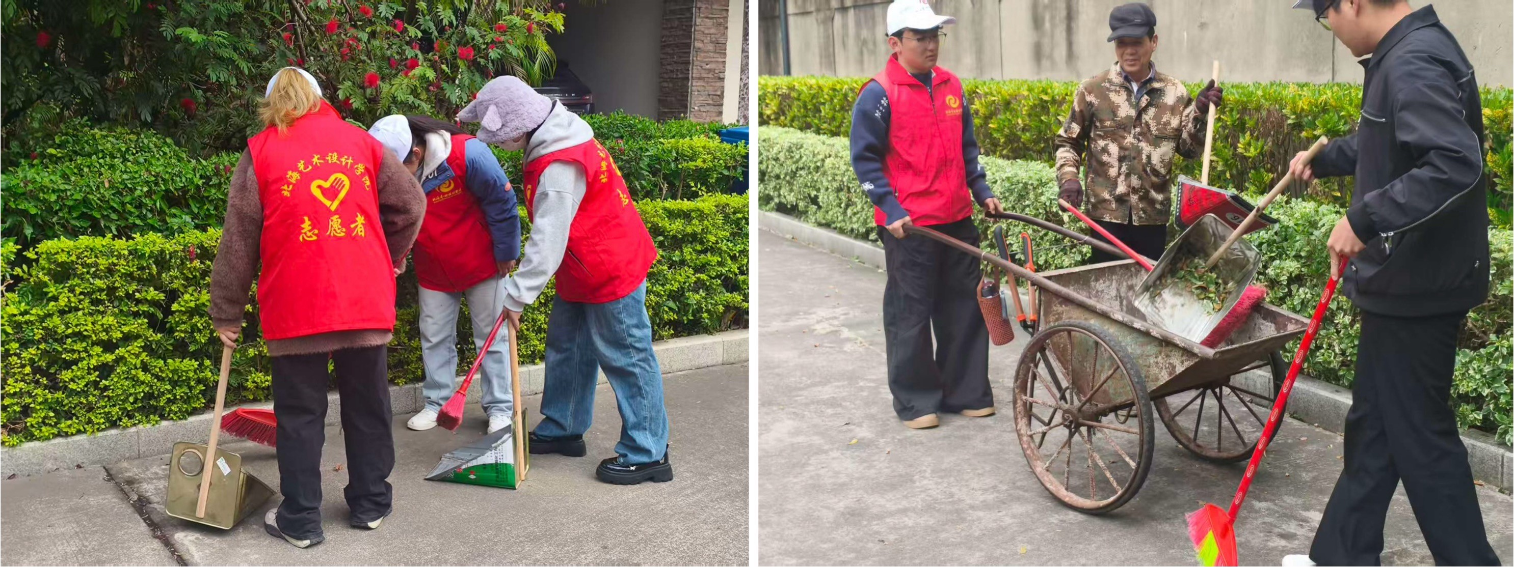 活动开始前,志愿者们统一穿戴志愿服装,携带扫帚、簸箕、垃圾袋等清洁工具,在协调下分组划定清理区域。随后,各组有序分散至小区各角落,清扫路面落叶与垃圾,捡拾绿化带内的纸屑、塑料袋等杂物,并针对卫生死角进行重点清理。劳动过程中,志愿者分工协作、细致认真,展现出良好的团队精神与劳动热情。