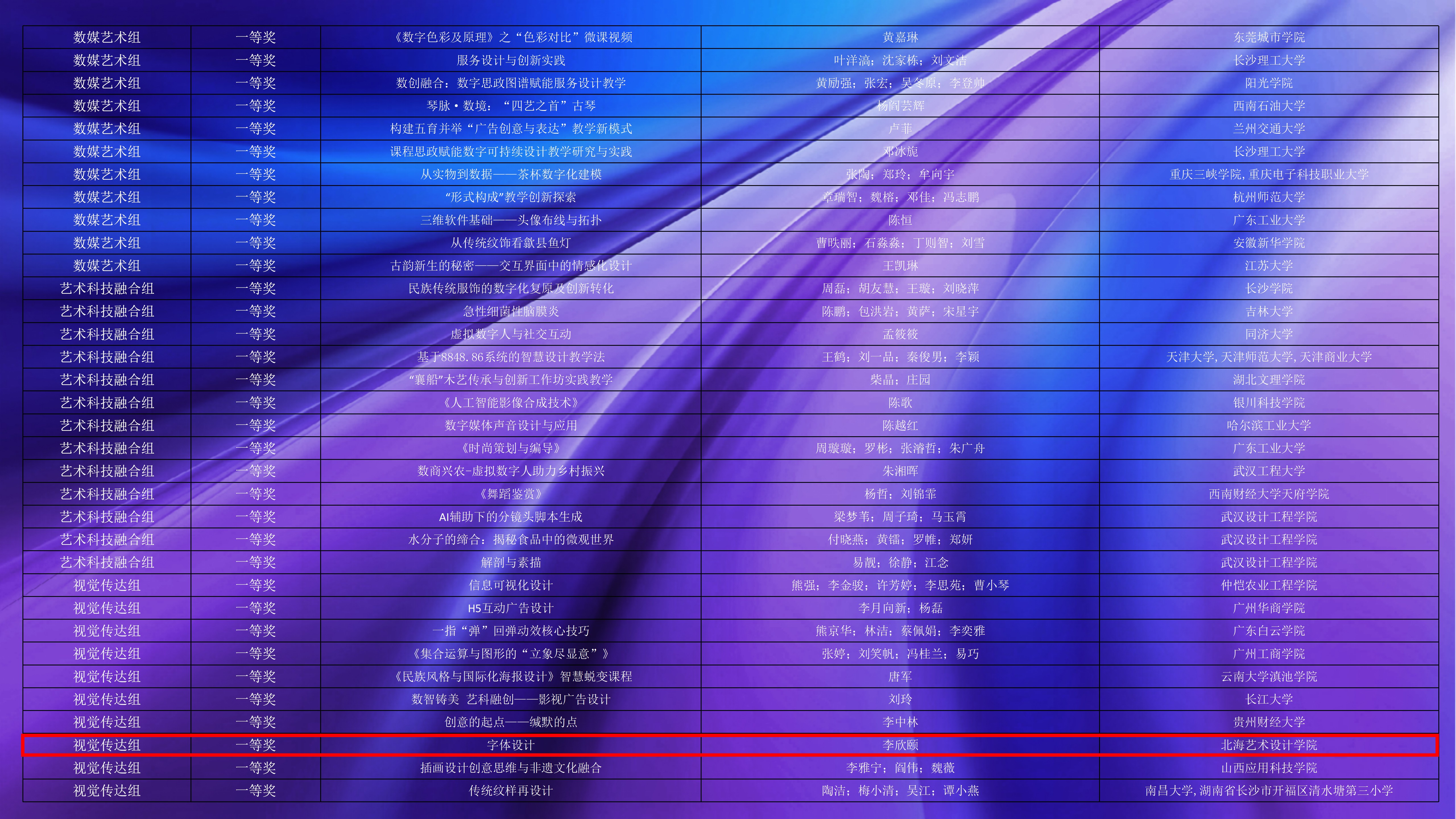 近日,第八届全国数字创意教学技能大赛圆满落幕。我校视觉传达设计专业专任教师李欣颐凭借《字体设计》课程出色表现,从全国5620名参赛教师中脱颖而出,荣膺全国一等奖。