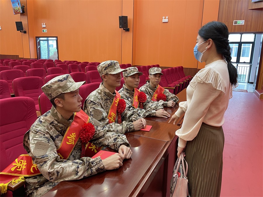 刘玲花副处长与入伍学生交流时,代表学校对四位批准入伍学生表示热烈祝贺,对他们积极响应国家号召应征入伍的举动表示肯定。她表示,希望大家在部队能够保持良好的品质、坚定的意志,尽早适应部队生活,刻苦训练,努力学习,把自己锻炼成新时代的合格军人,成为学校和家乡的骄傲。