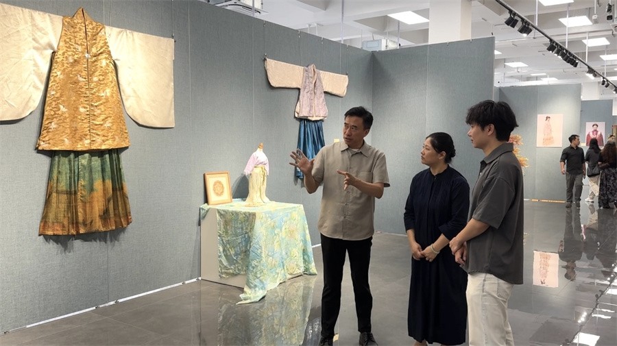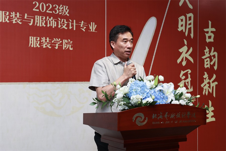 展览开幕式上,副校长陶立阳在致辞中表示,学校对中华民族优秀传统文化教育高度重视,此次作品展体现了学生对中国传统文化的深刻理解与创新表达。展望未来,陶立阳副校长鼓励学生利用人工智能等科技手段,将传统与现代融合,推动中国传统服饰文化走向世界。