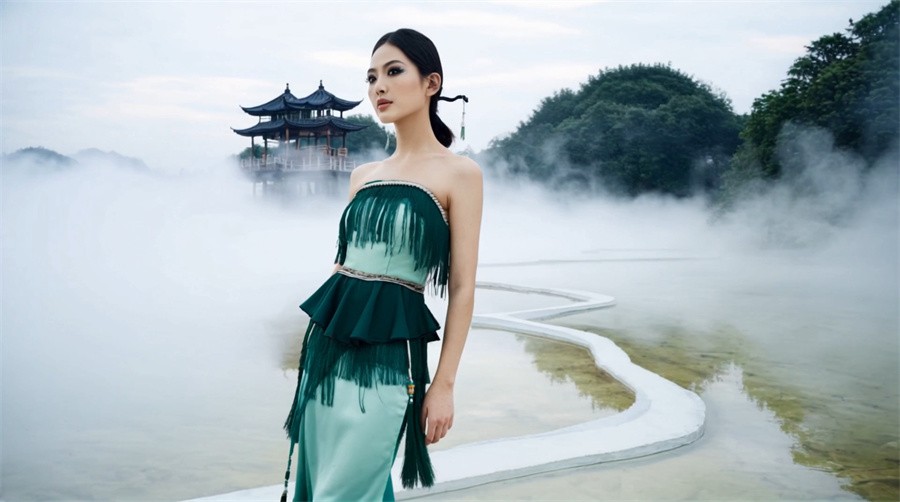 虚拟时装秀由服装学院师生组成的AI时尚团队以AI生成模型为创作引擎,通过对手绘效果图和成衣图像数据训练,精准理解并还原服装的色彩氛围、面料质地和廓形结构,生成虚拟动态视频,再经过后期渲染与剪辑,实现从草图到成衣再到虚拟时尚形象的智能创作,完成现实与虚拟效果交互,呈现了AIGC融入教学改革、跨专业交流等方面的最新成果。